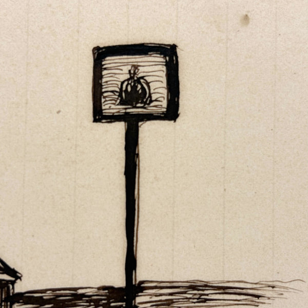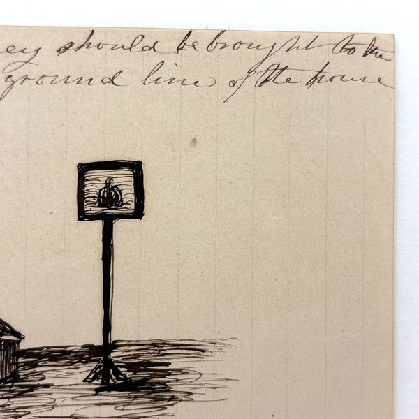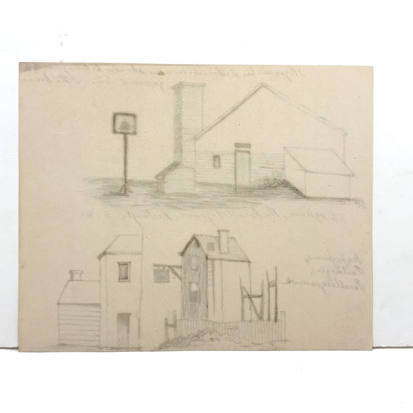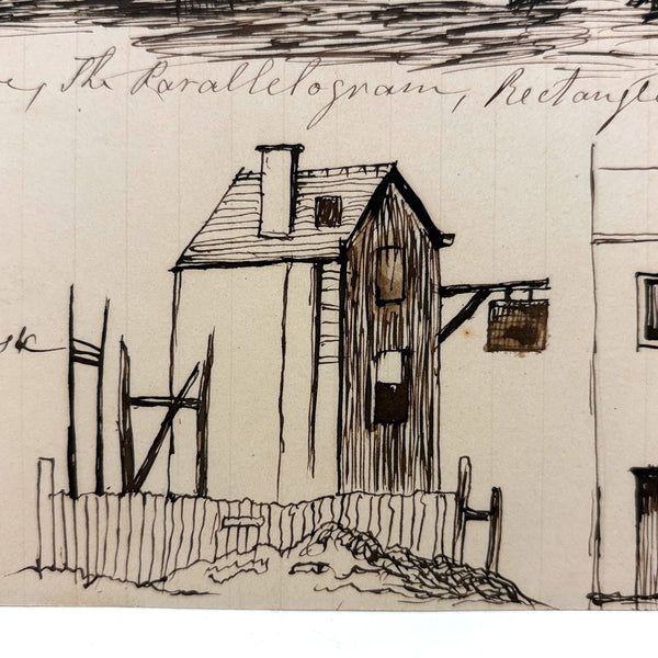 This was loose among a larger lot of 19th century perspective drawings, including a full notebook (listed a few weeks ago and still available as of this writing.) I find this one quite satisfying in a stand alone way--for the combination of structures, and maybe especially the combination of free standing and hanging signs. And the descriptive titles--"The square, the parallelogram, rectangle..."; "Trapeziums, Rectangles, Parallelograms," sound like poems to me! Plus a corrective note at top: "The ground line of this chimney should be brought to the ground line of the house," which makes it feel as if still alive in the mind of its maker.