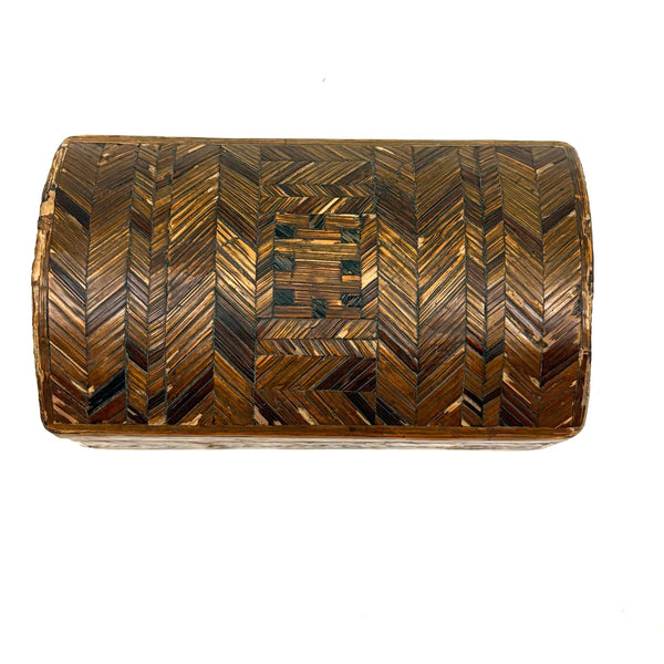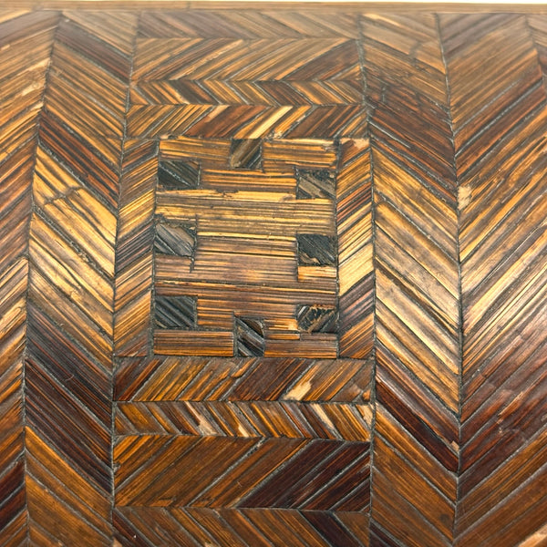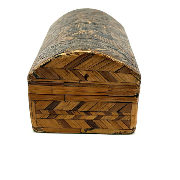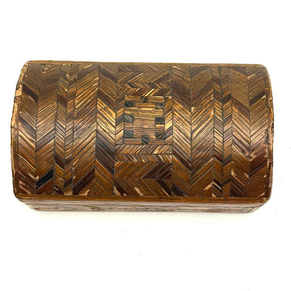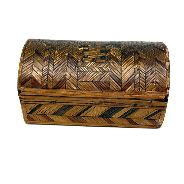 I have never paid very much attention to straw work, also called straw marquetry, but this miniature dome topped straw work box, lined with newspaper dating it to c. 1795, has converted me! Examples of this sort are most often referred to as Napoleonic prisoner of war work, as most pieces available today were made in England in prisoner of war camps and prison ships between 1793 and 1815--making this an early one. Drawing on traditions practiced in many parts of the Far East and Europe for centuries prior, the prisoners, primarily French and Dutch, applied their knowledge of straw work to construct boxes in this manner, often very elaborate, from the humblest of materials--manifestations of resilience and the drive to make things beautiful if there ever were. There is an excellent blog entry on the site of Garden Court Antiques, San Francisco, all about it here.