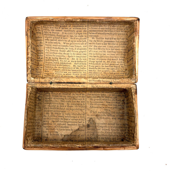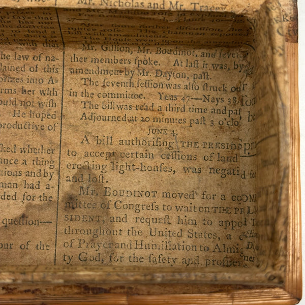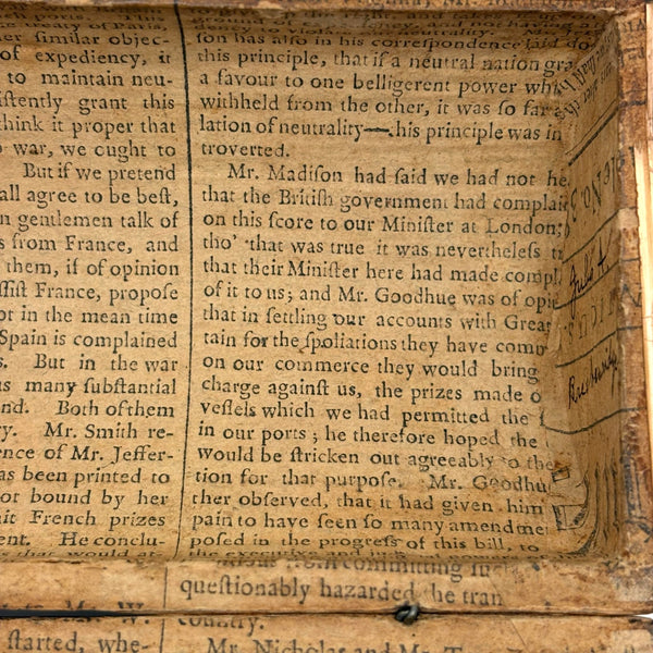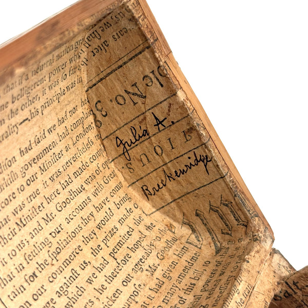 The newspaper lining here, rare to find as far as I have seen, shows the year 1795 and seems to be an American newspaper, speaking of Jefferson, and Madison, and American relations with England and France as well as Spain and Holland. It is signed Julia A. Breckenridge along one short side--perhaps a member of the prominent Breckenridge family that included Revolutionary War General Robert Breckenridge and US Attorney General John Breckenridge, appointed by Jefferson. Lots to dig into here, quite an amazing piece of history!