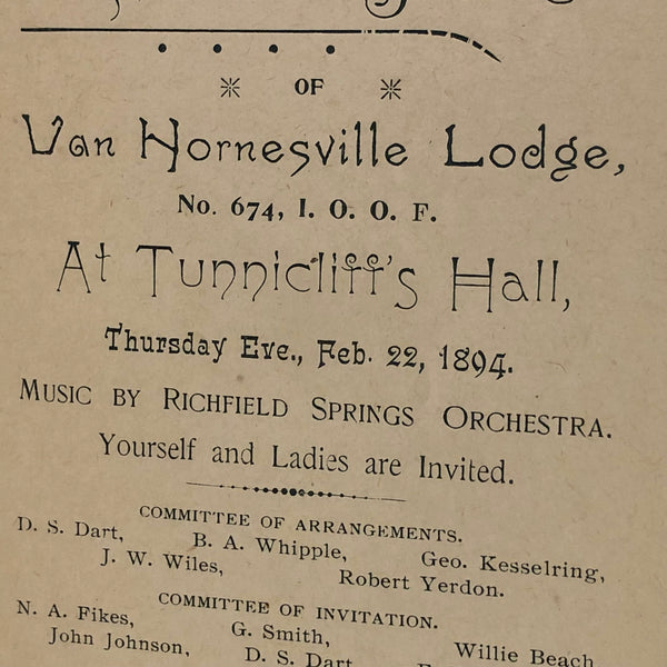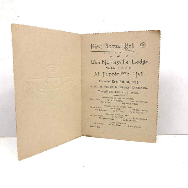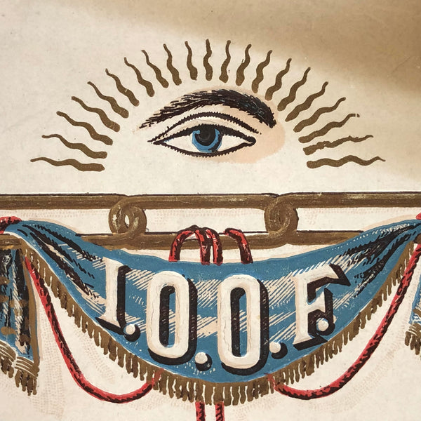Hard to beat an all seeing eye, and I think the golden rays framing this one are especially good, as is the lettering on the banner hanging below it. With three gold links from which that blue banner hangs. Looks like silkscreen to me, printed on the face of an invitation to the First Annual Ball of the the Van Hornesville (NY) Lodge, 1894-- to which "yourself and ladies" were invited!