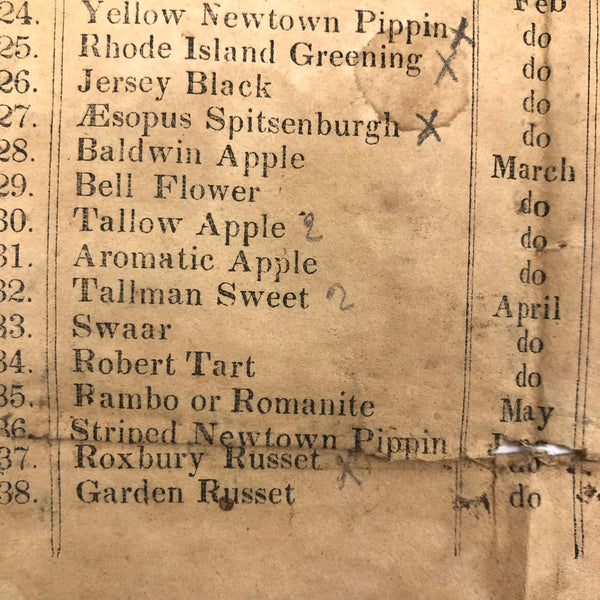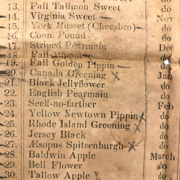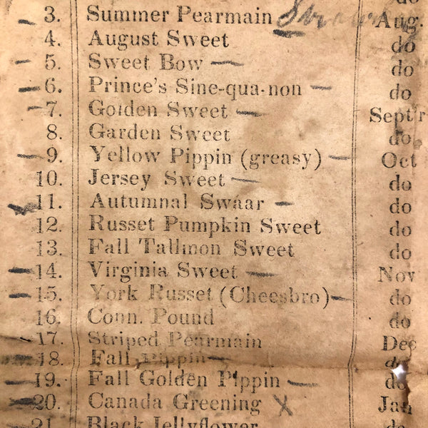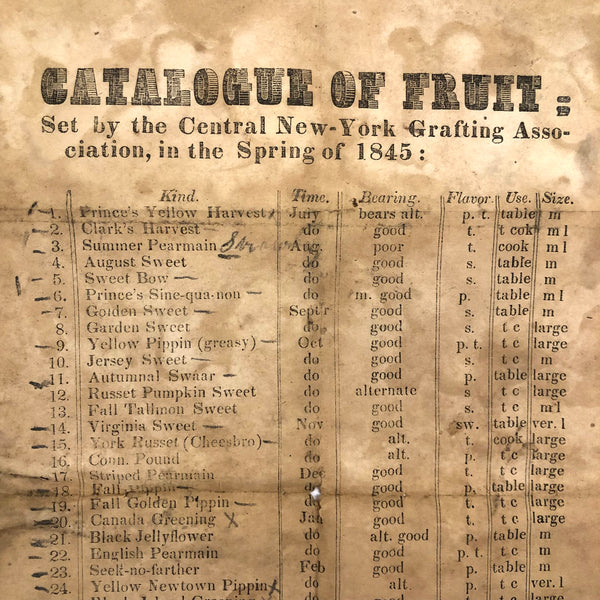 I loved finding  this one in a stack of very old papers--a 1845 list of "Fruits" publishing by thee New York Grafting Association--with all of those fruits being apples, I believe. I'm often looking at old brass stencils used for painting apple crates and barrels, which sometimes bear the names of varieties with which I am unfamiliar--but what a much more comprehensive and unfamiliar list this is, with as many varieties I've never heard of as those I have. A perfect gift for the heirloom farmer or apple lover I'd say, rare and special.