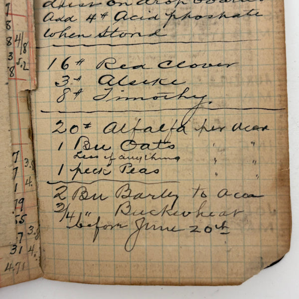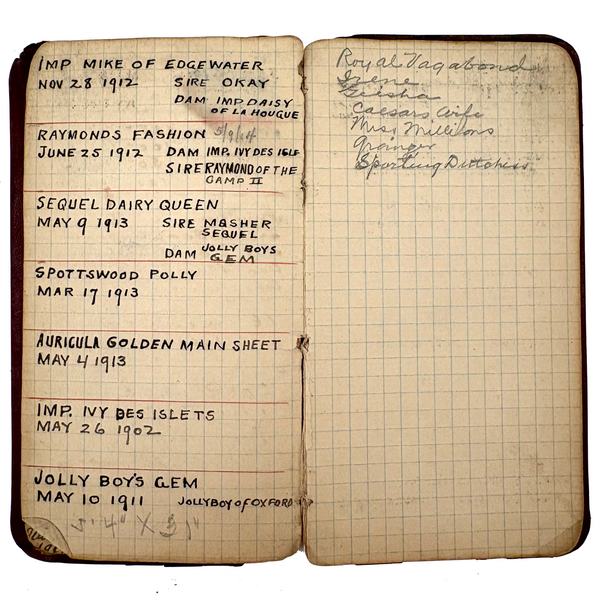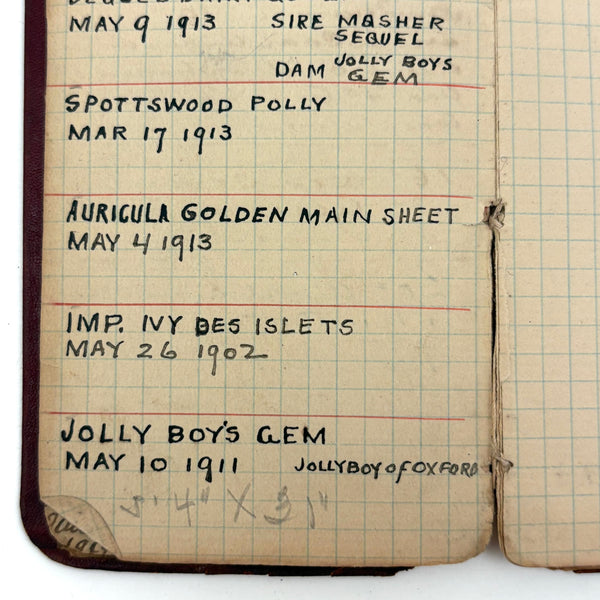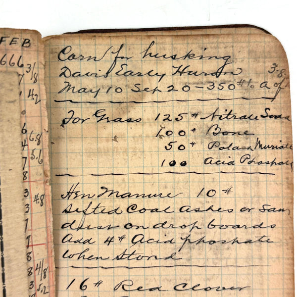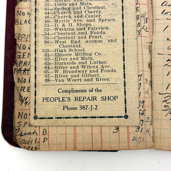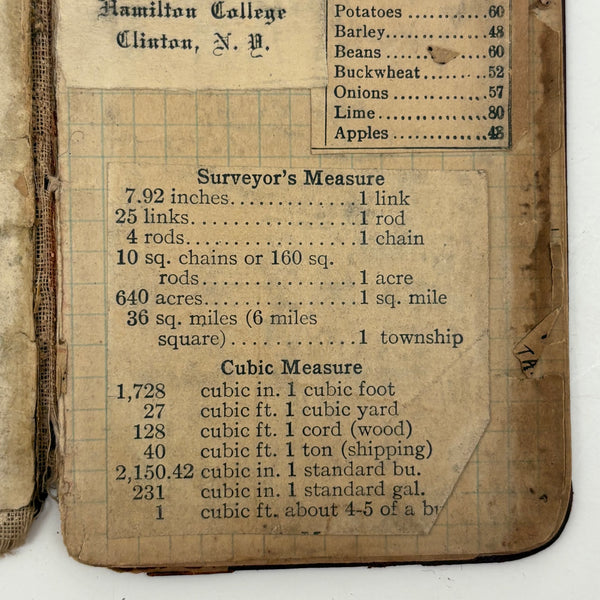A curious little pocket notebook, which I love for its combination of contents--the cutout photo portrait, with fraternity affiliation just below, and then pasted in lists of measures, recipes for making animal feed, fire alarm codes, and then, very carefully written on gridded paper, what I've figured out is a list of winning race horses. Methinks this young man was, most passionately, a betting man, even while studying agriculture at Hamilton College. A fun and also quite visually satisfying one in all of its layering.