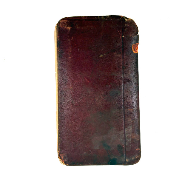 5 1/4" x 2 7/8". 6 pages (leafs). Inside front and back covers plus first two pages recto and verso filled plus 3rd front of page partially used. Well worn but holding together.