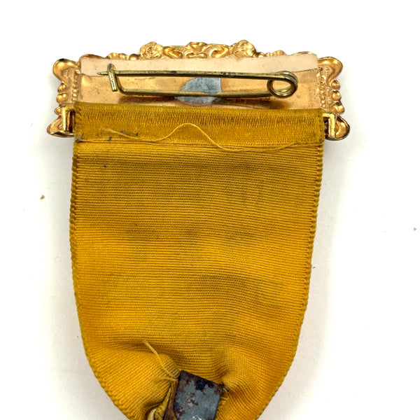 4 1/2" t x 1 5/8" w. Age spots to the celluloid surface of the shaking hands, and some red stain on the bottom of the gold ribbon where it meets the loop, but sound and stable, ribbon not fraying and ready to wear or pin up!