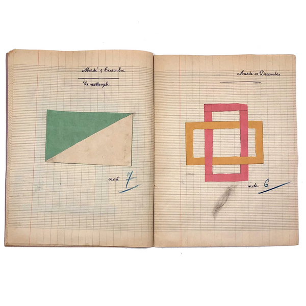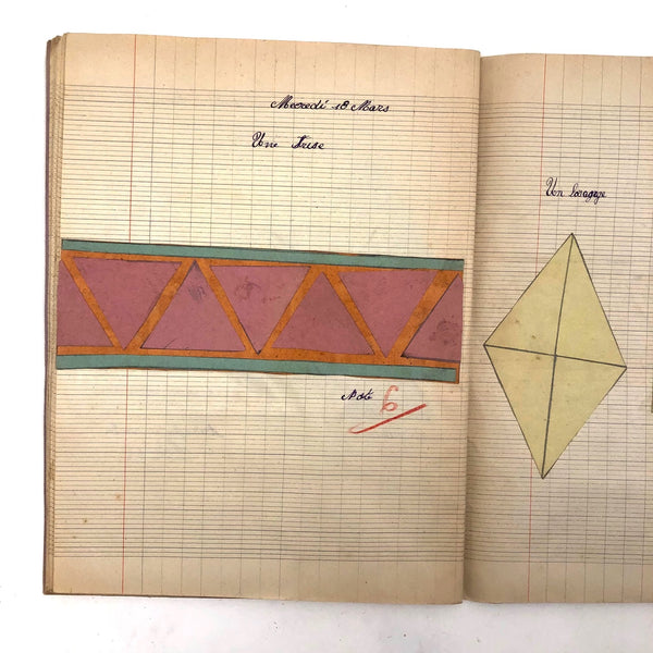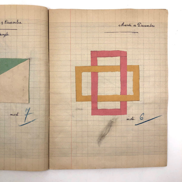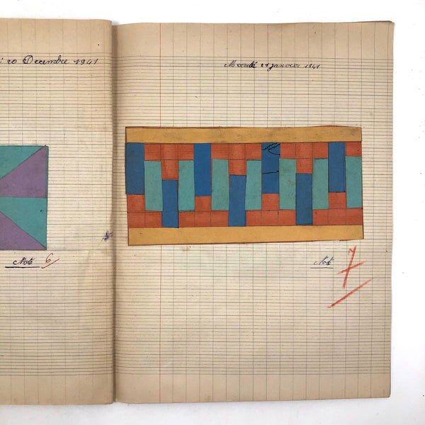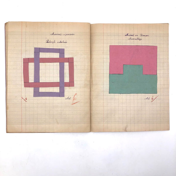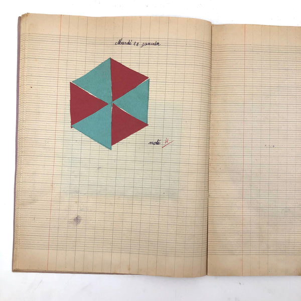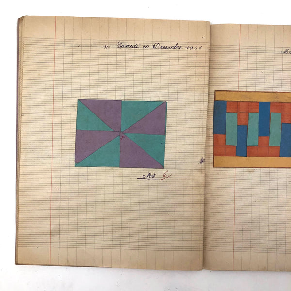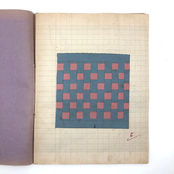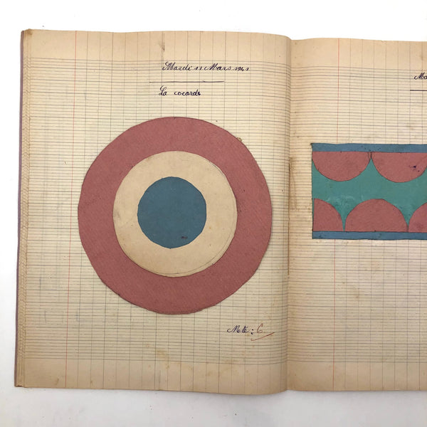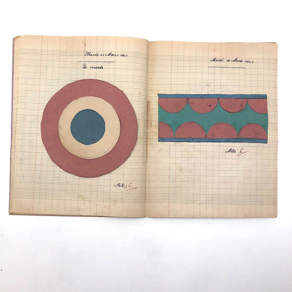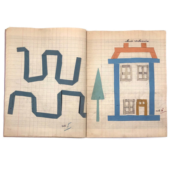 My personal favorite find of the week, this one came from a seller in France, completed by a Roland Vigneron 1941-2. Not sure what grade young Roland was in when he did this, but it definitely feels Froebel kindergarten inspired, with can array of cut paper weavings and forms adhered to its pages, all executed in what I find quite a sophisticated, and also very French, sort of palette. Primarily abstract shapes and patterns achieved through combinations of them, but with an excellent house and tree in among them too. And with a teacher's grade on each. To my eye, pure beauty.