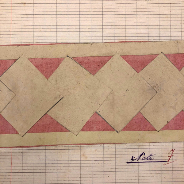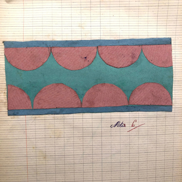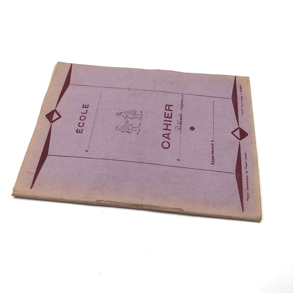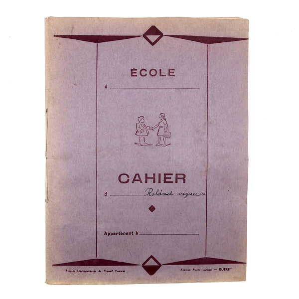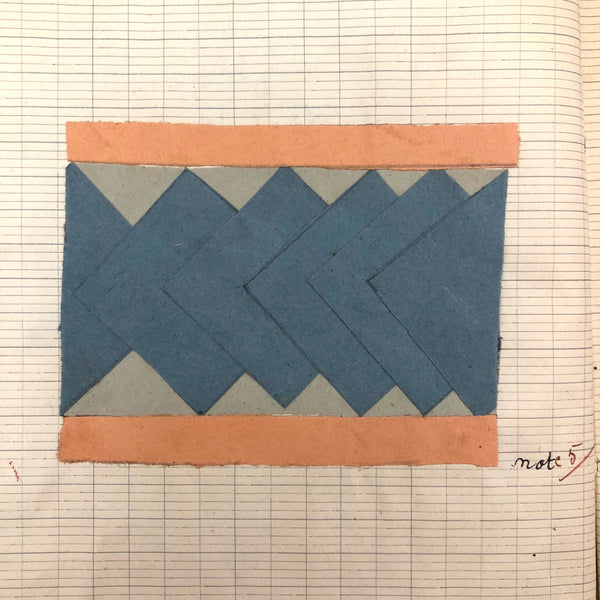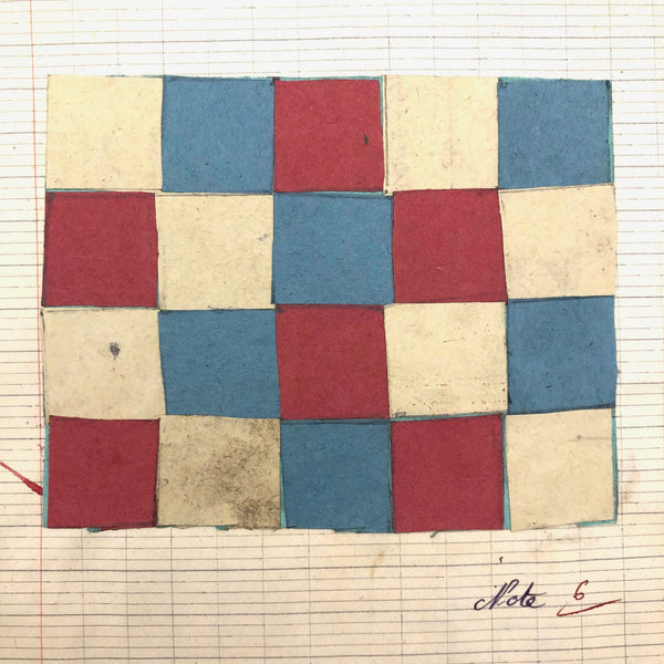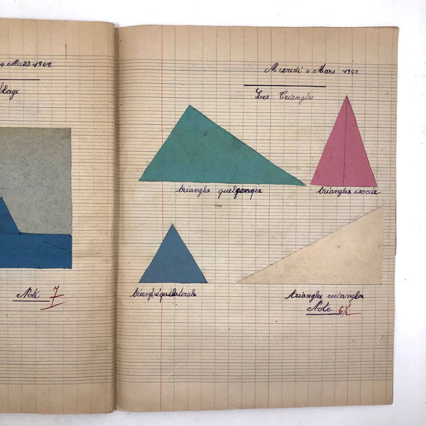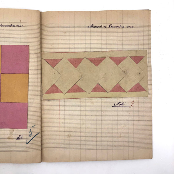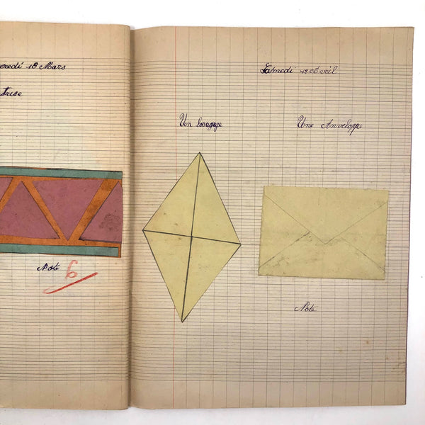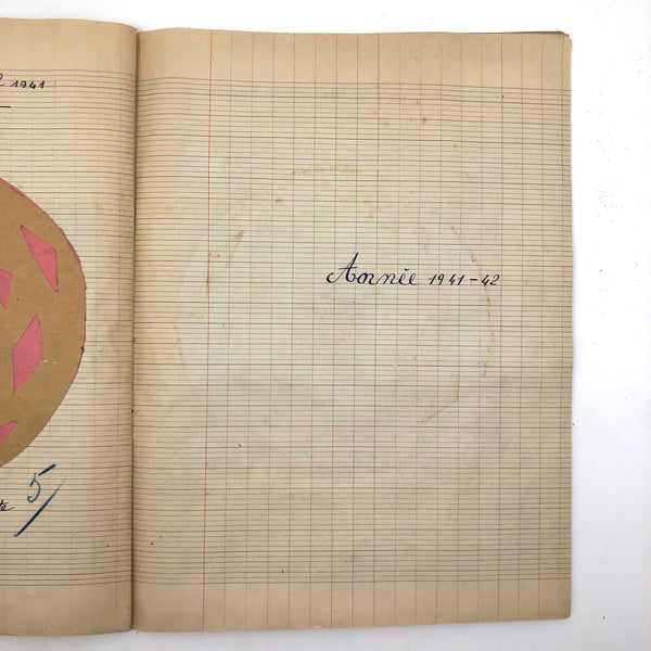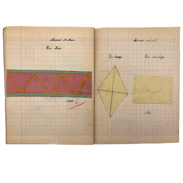 My personal favorite find of the week, this one came from a seller in France, completed by a Roland Vigneron 1941-2. Not sure what grade young Roland was in when he did this, but it definitely feels Froebel kindergarten inspired, with can array of cut paper weavings and forms adhered to its pages, all executed in what I find quite a sophisticated, and also very French, sort of palette. Primarily abstract shapes and patterns achieved through combinations of them, but with an excellent house and tree in among them too. And with a teacher's grade on each. To my eye, pure beauty.