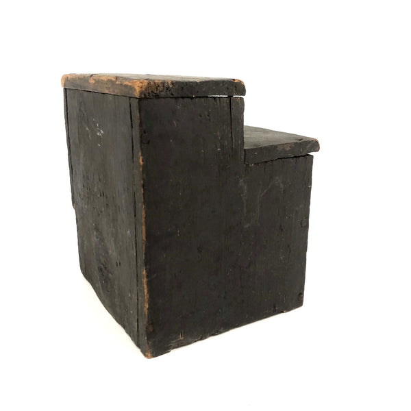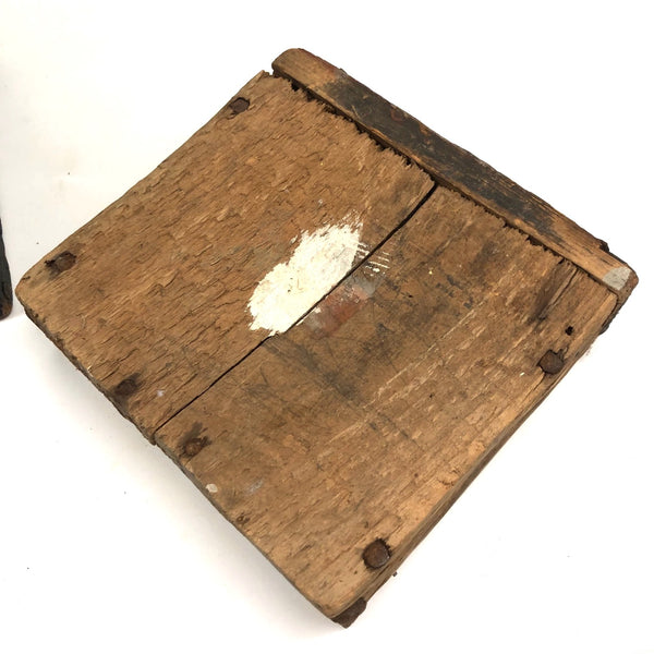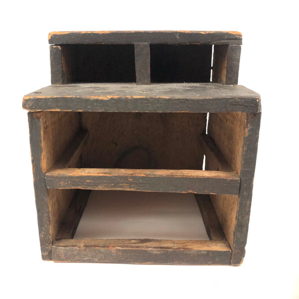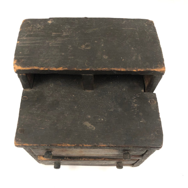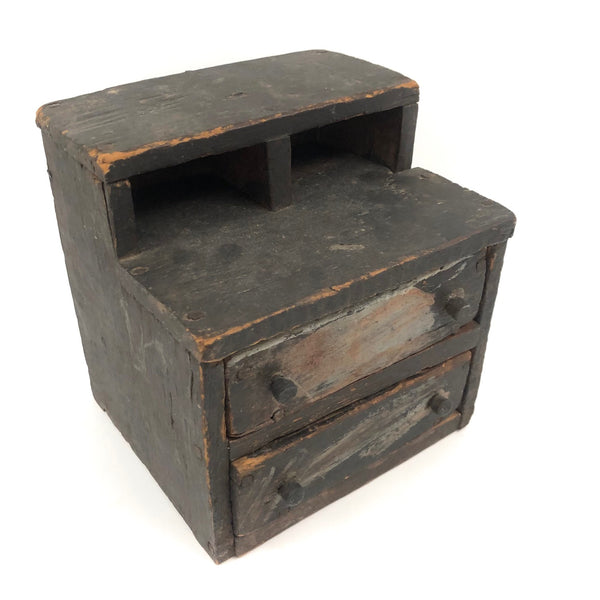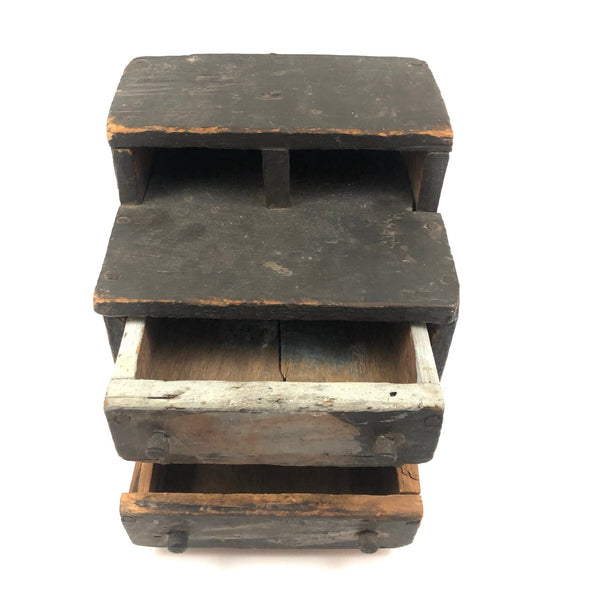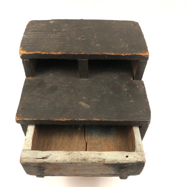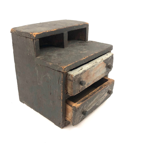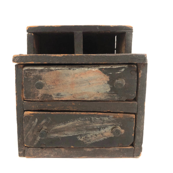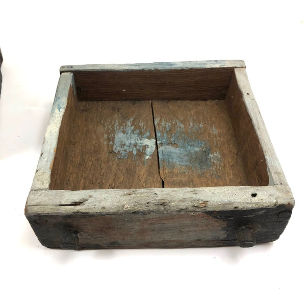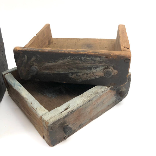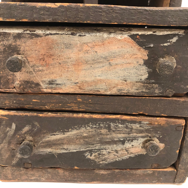 This one is old. And with a really sweet and special feeling about it, too. I imagine there were once two small, short drawers that fit into the niches at top--long gone, but one doesn't really miss them. I'm not sure the story with the paint across the front of the two existing drawers, but it is definitely old too--I think of the same period as the gray, which is original to it; perhaps the maker was considering a more decorative treatment but decided to leave it alone. (And so, perhaps, those upper drawers were in fact never completed?) Who knows? But here is it. Made of pine I believe, with hand-forged square nails holding it together.