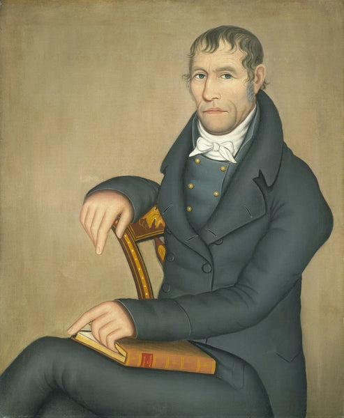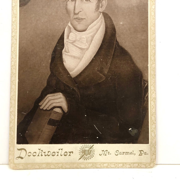 I love an antique photograph of a painting, especially a portrait, but this one is special because I have have identified the subject and even more so because I am fairly certain this painting of him was done by now widely renowned early 19th c. itinerant New England/New York folk artist Ammi Phillips. A google image search turned up exactly one useful citation--an image of this particular portrait on "Find a Grave" in conjunction with the gravestone of Edenezer William Walbridge (1779-1856) in the Lansingburgh Village Cemetery in Rensselaer County, NY. A little more searching reveals a known portrait of Walbridge's wife Sally Morgan Walbridge painted by Ammi Phillips in 1820 (included in photos), which led me to think this one might be too. And, indeed, looking at portraits by Phillips from around 1820 (I've included two in photos) it seems highly likely that this is hers too--they even have matching drapes! That's my best original research in a while--and perhaps a real discovery as I can find no other reference to it.