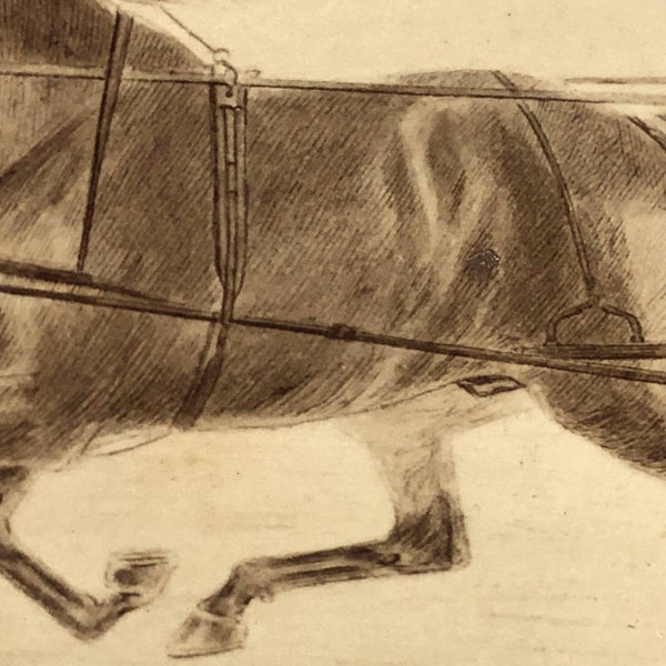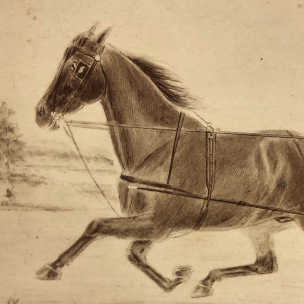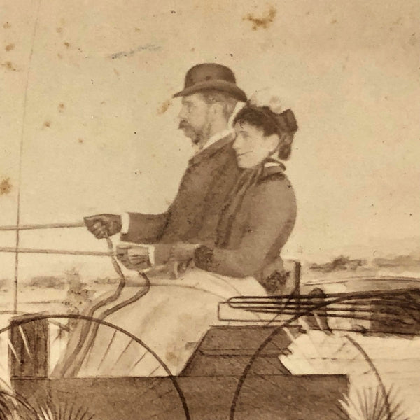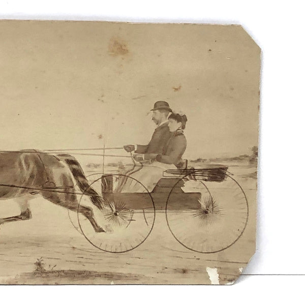 I'm not a photography expert, but I don't believe I've seen a 19th century photo (albumen print, mounted to card) with such an extensively hand-drawn situation as this one, with only the heads and torsos of the couple seated in the carriage appearing to be photographic likenesses. (I especially love the moment where their gloved hands meet the hand-drawn reins.) I love contexts, especially photographs, in which different media and modes of representation converge, here drawing and photography and also stillness and motion. And what a beautifully rendered horse and pair of wheels on that carriage, so delicately rendered in ink. Further, the image, which dates to the 1880s, seems very much in conversation with Muybridge's work of the same period attempting to capture a horse in motion through rapid fire sequential views. To my eye really a wonderful image, embodying both the possibilities and limitations of representation at a specific point in time, and feeling forever suspended in a sort of liminal space.