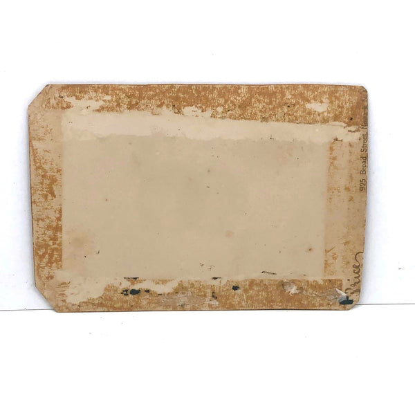 5 7/8" x 4" and in good condition, with three clipped corners and one small tear to the surface of the photo at lower right. On reverse is stamped 925 Broad St Newark, NJ. and at the far corner appears "Price" -- making me certain the photograph was produced by photographer Frank H. Price, a noted photographer active 1860s-early 1890s. Francis “Frank” Henry Price grew up in a photographic family; his father, Robert Taylor Price of Elizabethtown was a daguerreotypist by 1850. Frank, who served in the Civil War, became known for his Civil War era portraits, photographing men who served and their families. In 1881 he settled at 925 Broad Street, where he stayed until he moved next door in 1893, so this photo dates between 1881-1893.