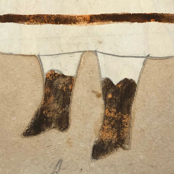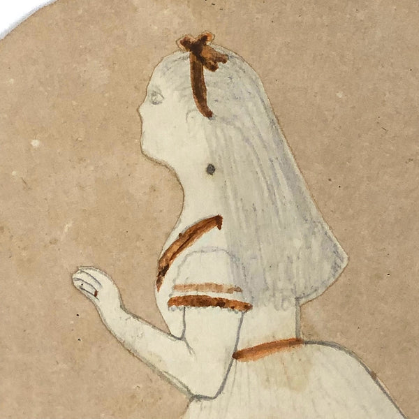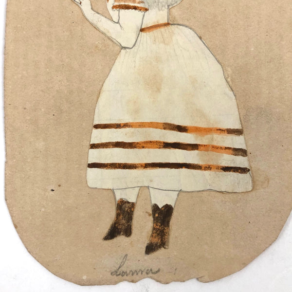 Four of these I found together, only one of them--this one--dated on the back, locating them all in 1873. It seems they may each have been done by a different school girl--all with a different name signed to the back, as well as a different subject named on the front. (Perhaps collected by a teacher?) A customer recently noted to me that naive drawings of this sort make her heart beat faster and the same is true for me, just pure joy, and also offering a strong and immediate sense of connection with the young girls who made them, who feel like sisters across time. And the painted skirt stripes and boots on this Laura are especially terrific. In a small period frame, she would really sing.