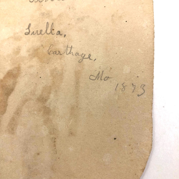 5 9/16 x 3 7/8 and in good antique condition, the portrait mounted to backing paper at the time of its making and signed Edna + Lirella, Carthage MO, 1873 on reverse.