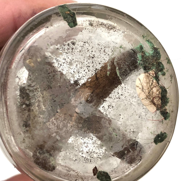 I've had much fancier bottle whimsies, but I think the more humble (though still completely baffling to me!) yarn winder types are my favorite of all. This one is 19th century, with carved wooden stopper (walnut I think?), held forever in place  by a cross bar just below the neck. With two "yarn winders" inside, held to the central post--one horizontal, one vertical, both wound with yellow and white yarn-- with the post standing on four arched feet. The bottle appears hand-blown, with pontil at the bottom.