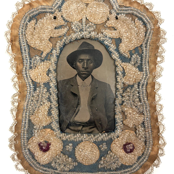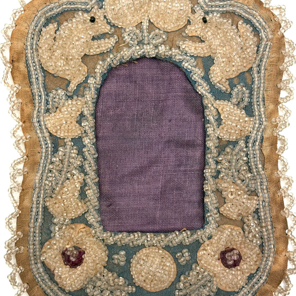 It is the two squirrels with black eyes and bushy tails facing each other at the top corners of this antique beaded frame that completely sold me on it--uncommon and just wonderful. And while I don't always love Iroquois/Mohawk beadwork made for the tourist market around Niagara Falls, this is I think a very fine and lovely and relatively early example (c. 1860s-80s I believe)--and frames are pretty rare to find. Just right, and just the right size for a cdv or tintype. (I've had this oval trimmed tintype portrait sitting around awhile and quite like him in it, so photographed it that way; it's not included, but contact me if interested.)