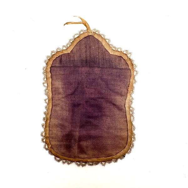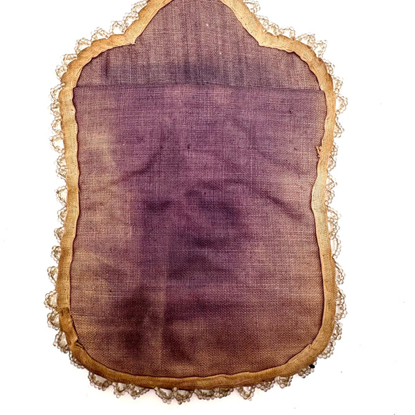 Overall 6 1/4" t x 4 1/2" w. Frame sight 2 5/8" x 1 3/4". Very good condition, stable and sound and not fragile, with just some loss of blue fabric backing around the squirrels and berries at the top, which one doesn't miss. The ribbon attached at top is separated in two so not a hanging loop, but could be knotted in order to function that way, or one could easily sew a small loop to the top of the back for hanging.