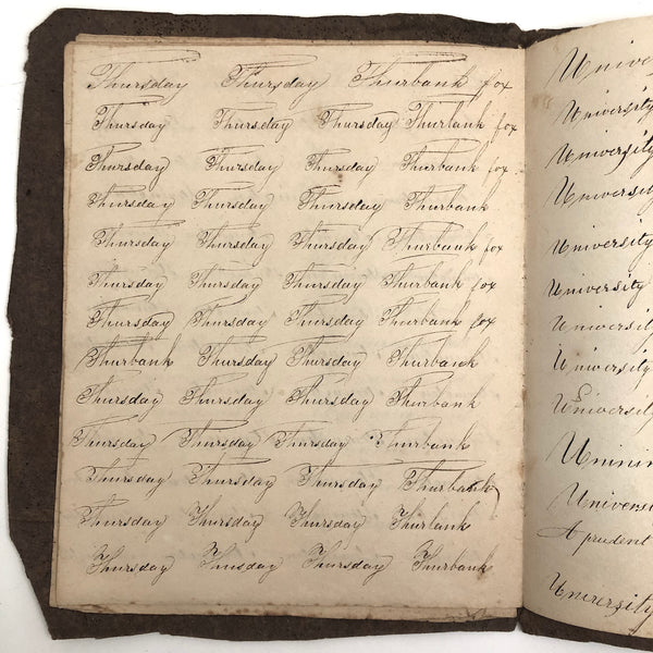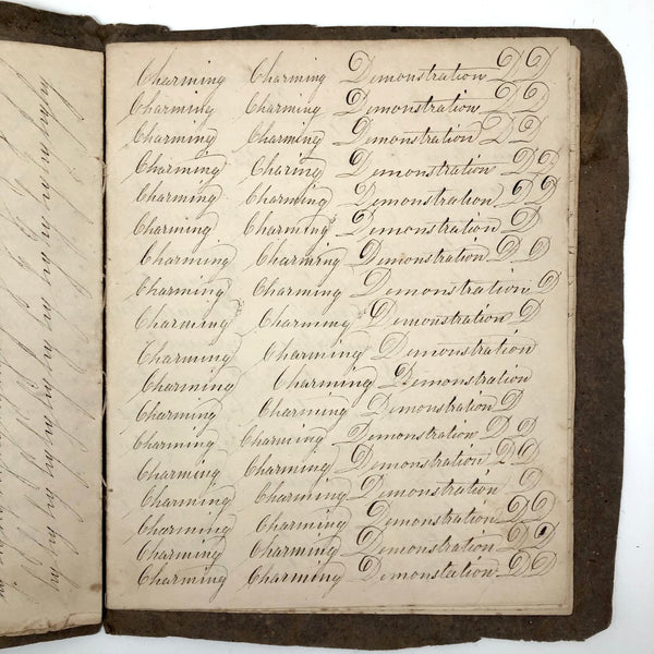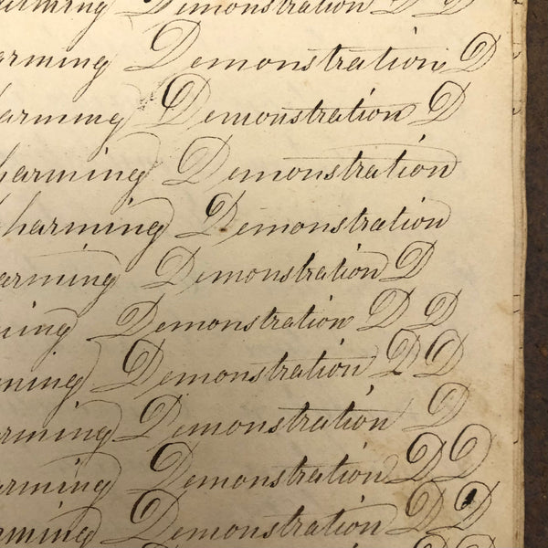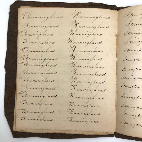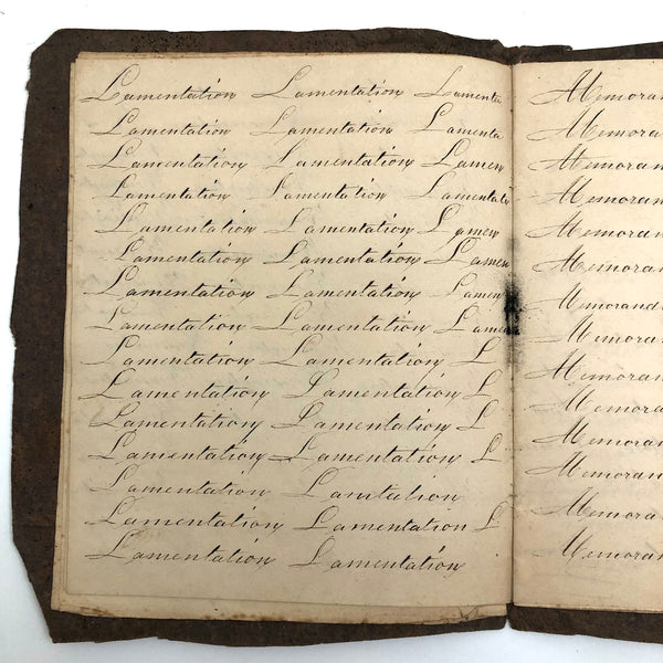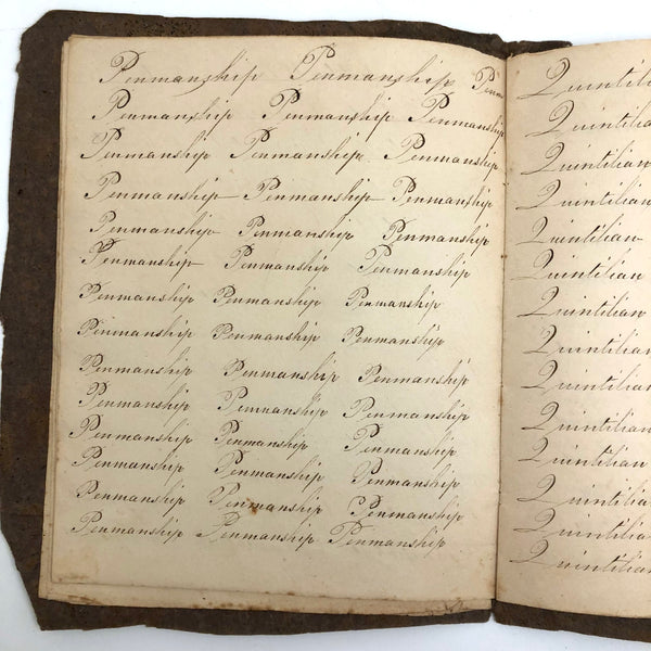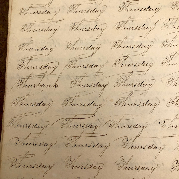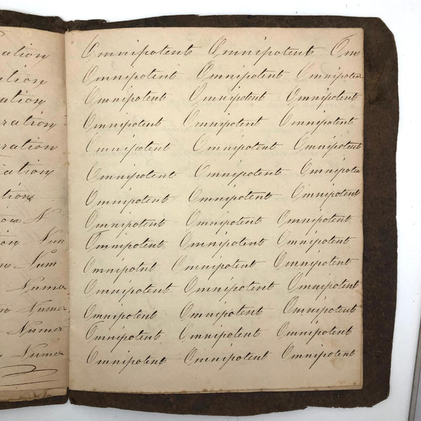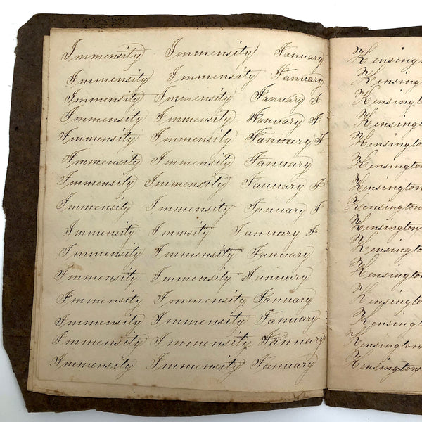 Another old penmanship notebook, because I can't pass them by, and find them all interesting in different ways. This early one, with thick handmade paper cover, is all about the repetition of single words over and over again--the outcome of which I find quite satisfying, formally and conceptually, especially when the word is, say "runninghand"! (Runninghand is a style of penmanship emerging in the late 1700s.in which letters are slanted and the words formed without lifting the pen from the page--and what a great word!) Plus charming, charming..demonstration (and some extra excellent D's at the end; a field of lamentations, and immensity, and pensmanship, etc. I'll never get over my love for these.