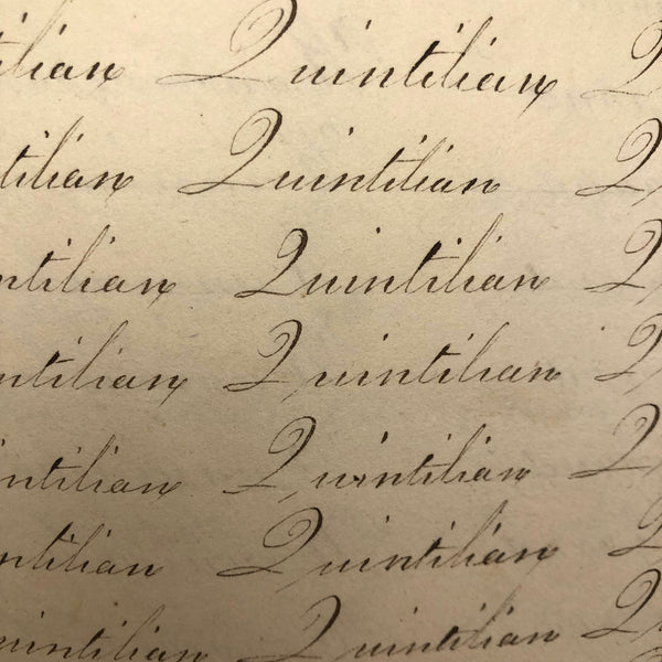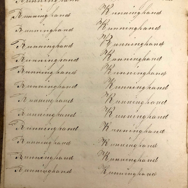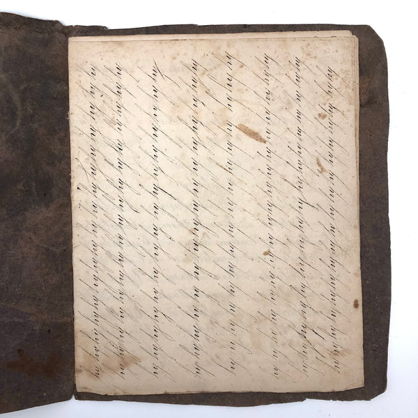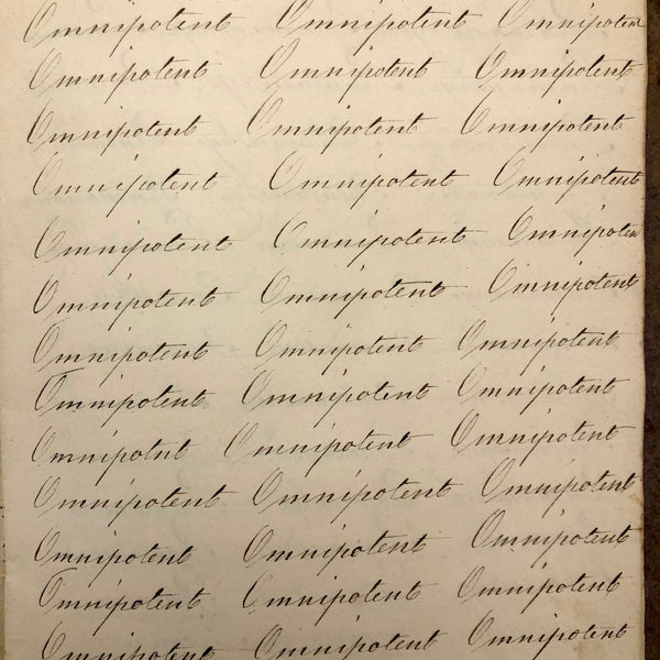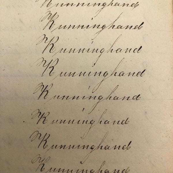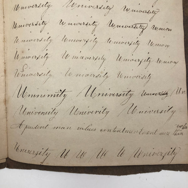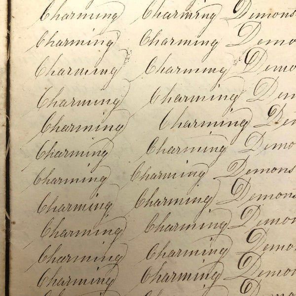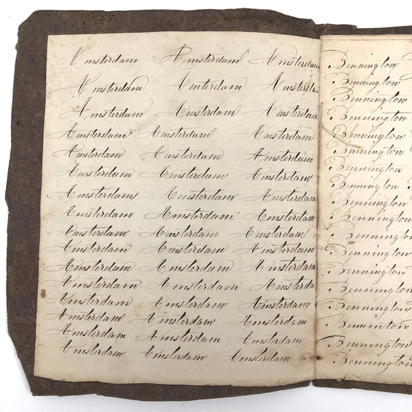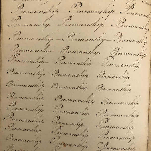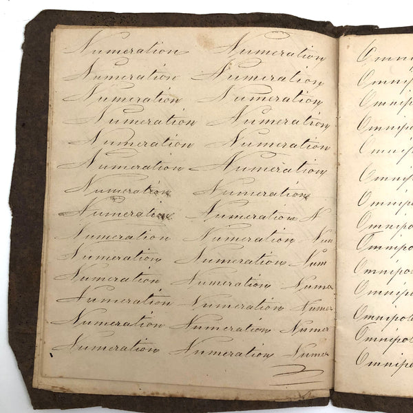 Another old penmanship notebook, because I can't pass them by, and find them all interesting in different ways. This early one, with thick handmade paper cover, is all about the repetition of single words over and over again--the outcome of which I find quite satisfying, formally and conceptually, especially when the word is, say "runninghand"! (Runninghand is a style of penmanship emerging in the late 1700s.in which letters are slanted and the words formed without lifting the pen from the page--and what a great word!) Plus charming, charming..demonstration (and some extra excellent D's at the end; a field of lamentations, and immensity, and pensmanship, etc. I'll never get over my love for these.