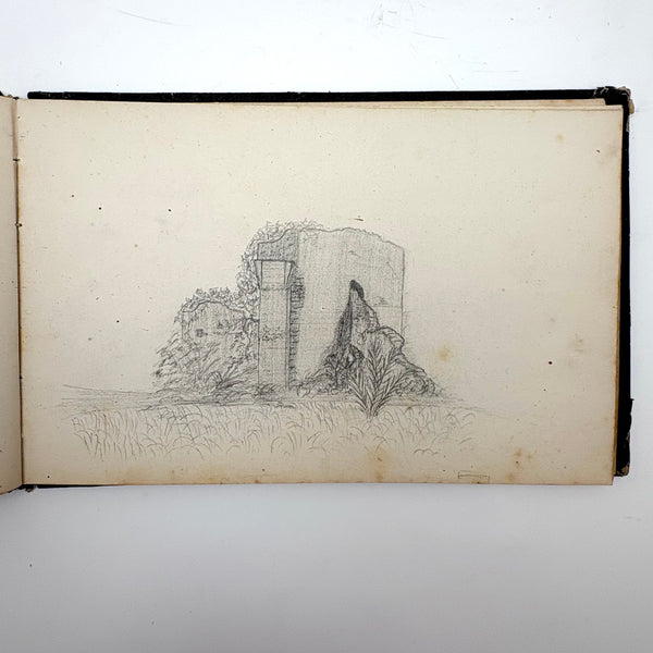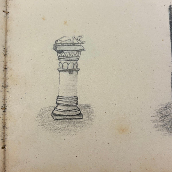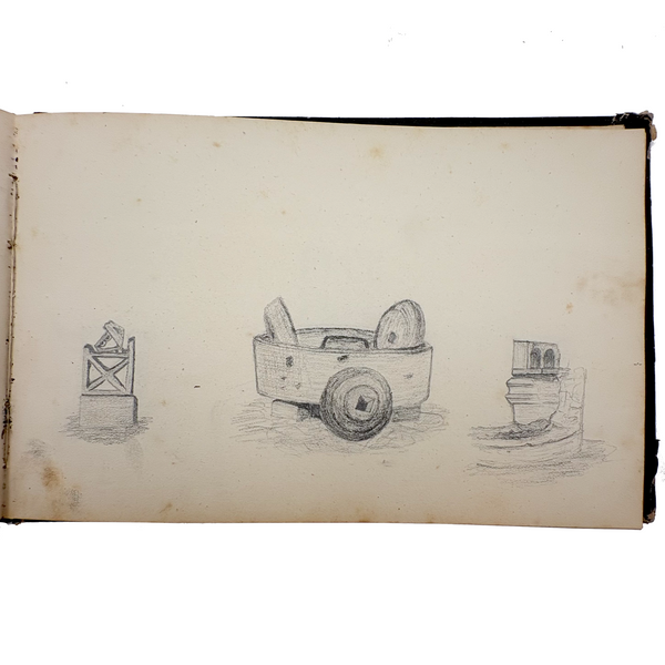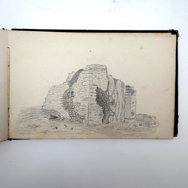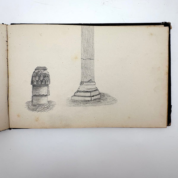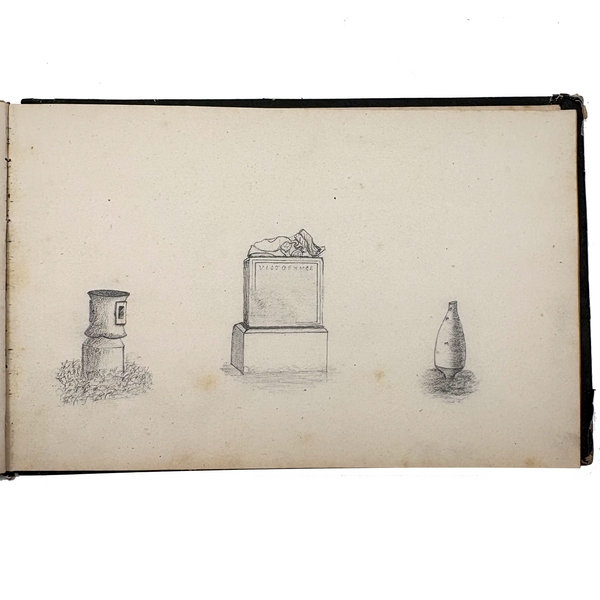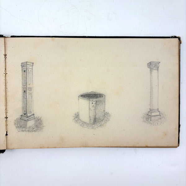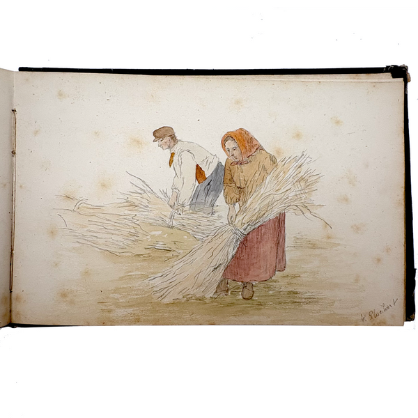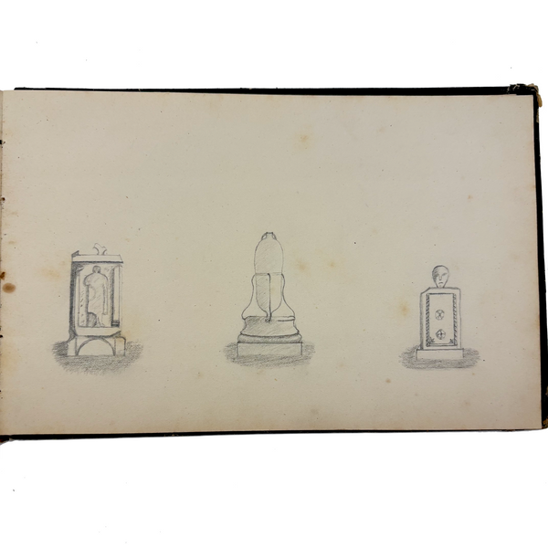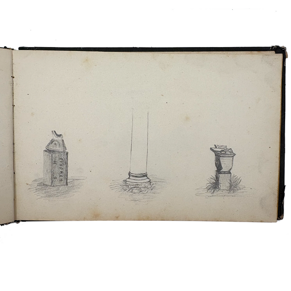 I believe this is a Grand Tour sketchbook of sorts, probably 1880s or so, carried along on travels through Europe. The first few pages are very carefully rendered watercolors of floral arrangements (they look almost like prints, but close inspection shows they are indeed watercolors). Much more interesting to me though are the much more naive sketches on subsequent pages, presumably rendered on site--of what look to be tombs/memorials and ruins (partial columns and the like), lined up two or three per page like curious little sculptures or vignettes. I find them highly empathetic and completely charming and think they have an almost sci-fi sort of sense to them, as if specimens discovered on anther planet, perhaps components of some mysterious experiment. Really great! And lots of them. Then some more elaborate views of rocks and ruins in landscape context, followed finally by a couple of pages with skillfully done portraits, two sketches of a woman in traditional dress, and a watercolor of two workers harvesting grain.