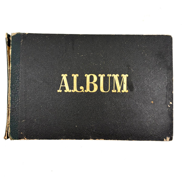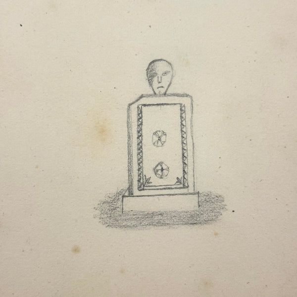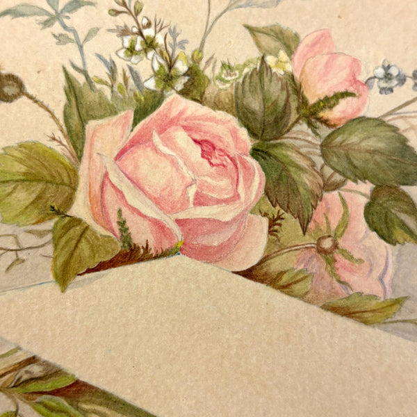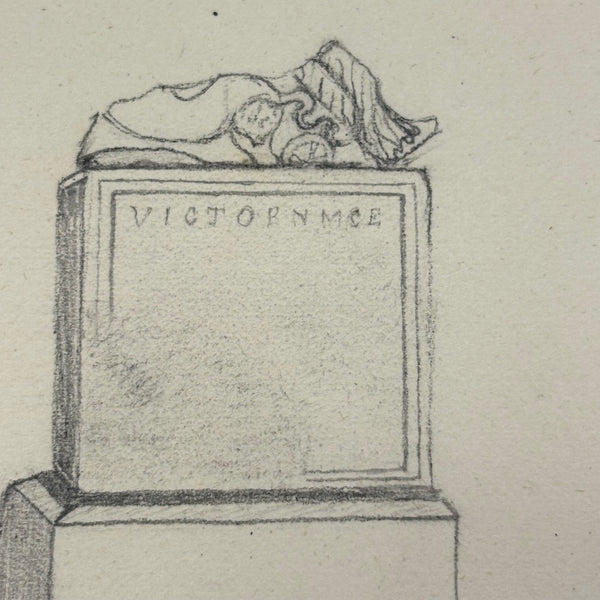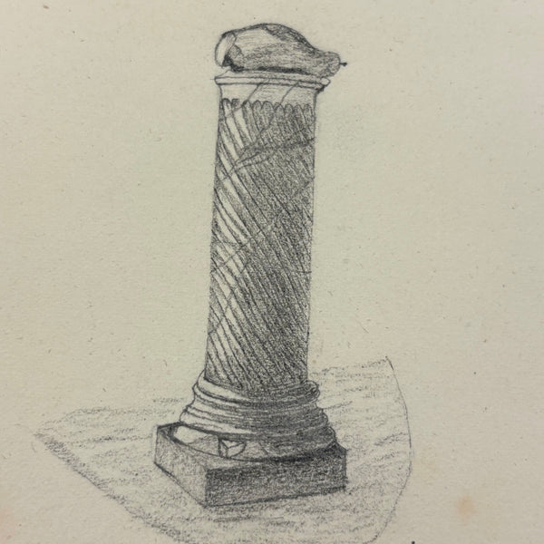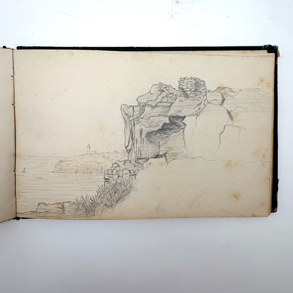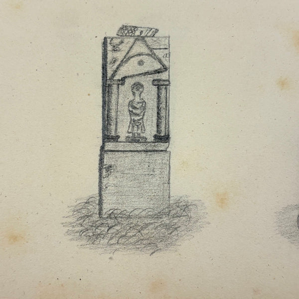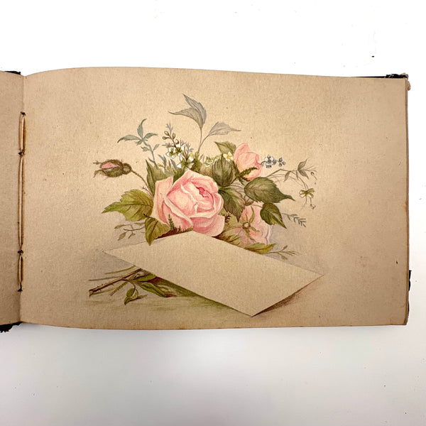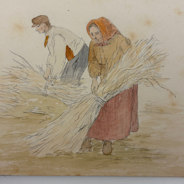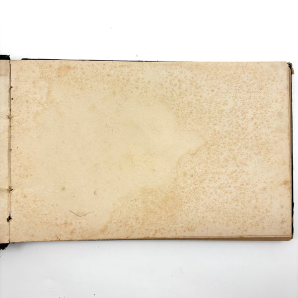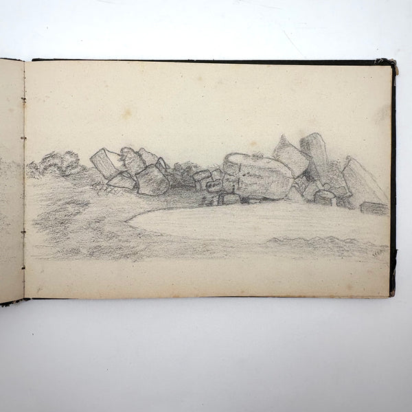I believe this is a Grand Tour sketchbook of sorts, probably 1880s or so, carried along on travels through Europe. The first few pages are very carefully rendered watercolors of floral arrangements (they look almost like prints, but close inspection shows they are indeed watercolors). Much more interesting to me though are the much more naive sketches on subsequent pages, presumably rendered on site--of what look to be tombs/memorials and ruins (partial columns and the like), lined up two or three per page like curious little sculptures or vignettes. I find them highly empathetic and completely charming and think they have an almost sci-fi sort of sense to them, as if specimens discovered on anther planet, perhaps components of some mysterious experiment. Really great! And lots of them. Then some more elaborate views of rocks and ruins in landscape context, followed finally by a couple of pages with skillfully done portraits, two sketches of a woman in traditional dress, and a watercolor of two workers harvesting grain.
