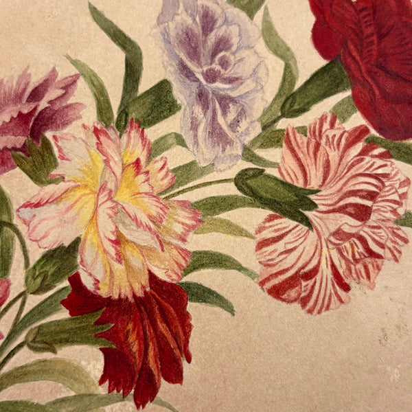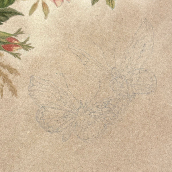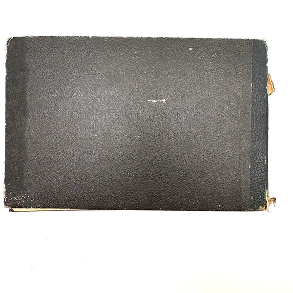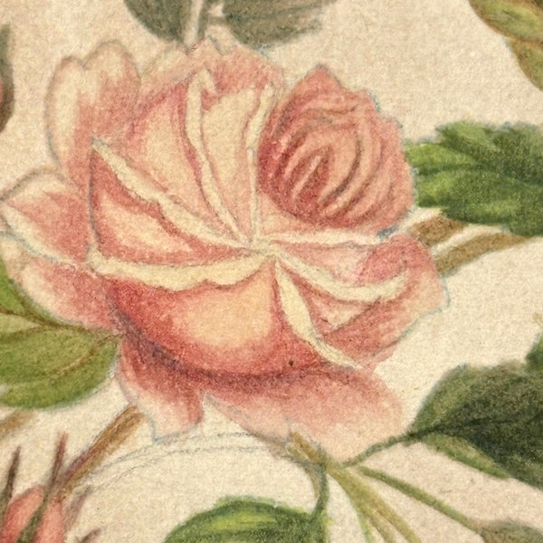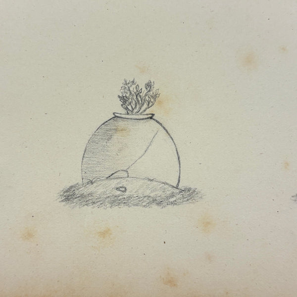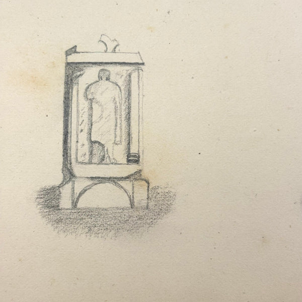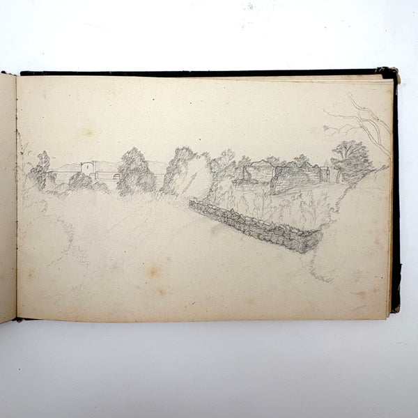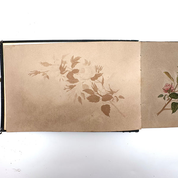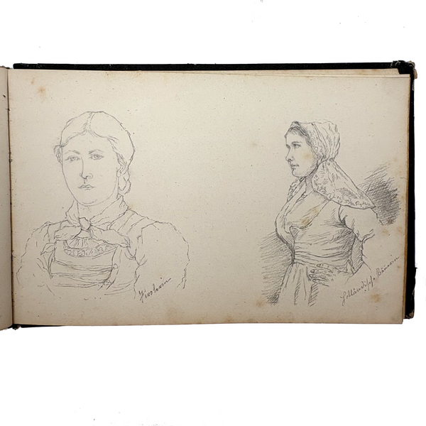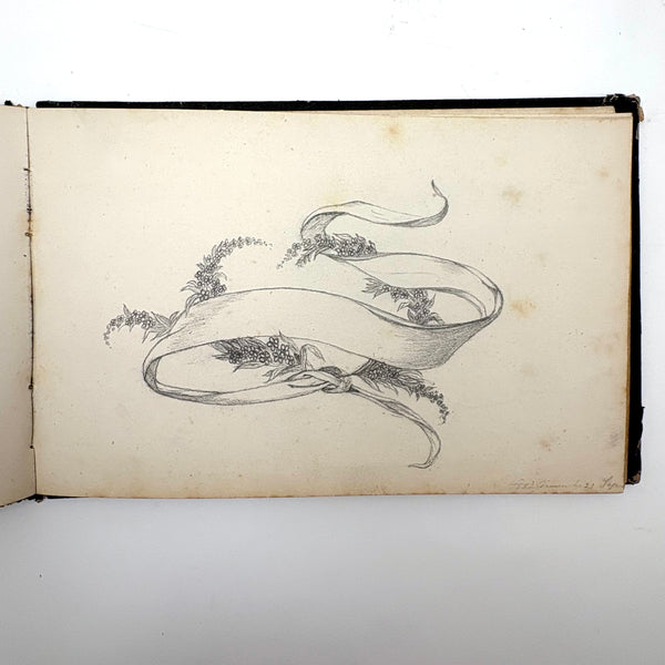 8 3/8 x 5 1/2". 25 pages of watercolor and graphite drawings, one side only. 3 floral watercolors at front of notebook, then graphite drawings, then one figural watercolor last. Photos show a few favorites first then document in order. Some blank pages interspersed. All in good condition, some toning spots and toning around the edges as documented. Paper not fragile, and no notable tears. Spine is very worn but binding holding okay.
