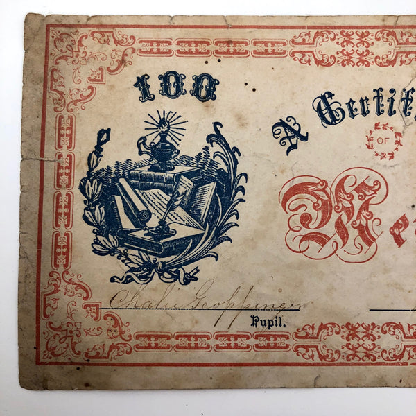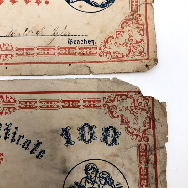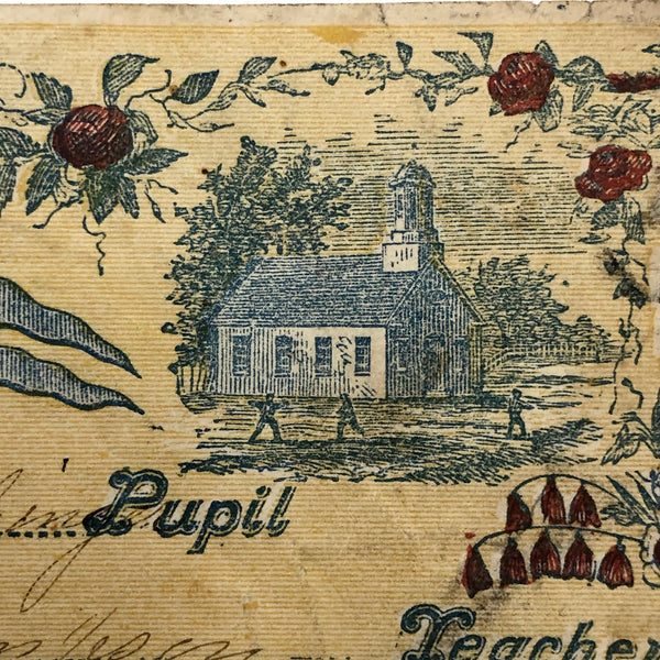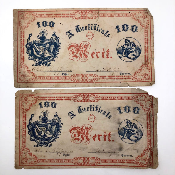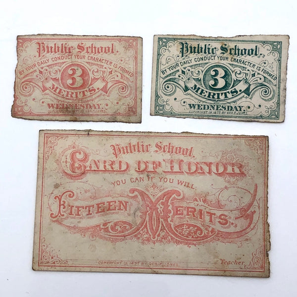 I think these are just wonderful, and who doesn't know someone who could use a little recognition of their merits?! These were awarded to a young "Master Charley Geoppinger" in the late 1870s or so by a couple of different teachers - two of them for a hundred merits, one for twenty, one for 15 and two for three. I believe these would have been saved to either cash in for some prize, reward, or further honor, but I am not certain precisely what. I really love the inspirational phrases most of them bear: "You Can if You Will" on the 15, "By Your Daily Conduct Your Character is Formed" on the threes, and "Look Up and Press Onward" at the end of the poem on the twenty!