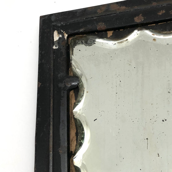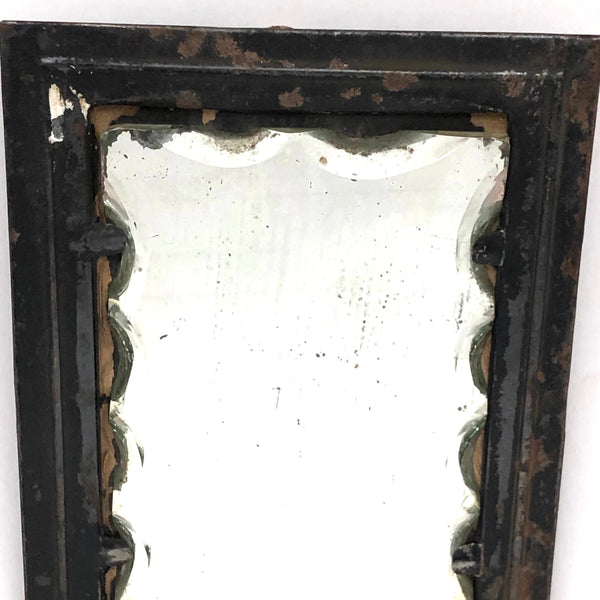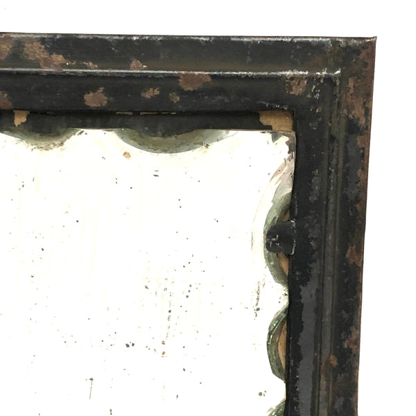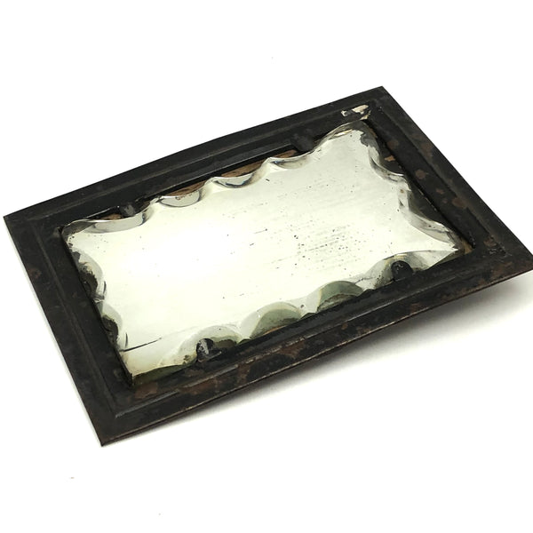 I found one other scallop edged antique mirror--held in place just by four tabs along the sides of black painted tin frame--just like this one that was described as Civil War era--and was accompanied by original shaving kit. I am not certain if that is correct, but it is definitely an old one, the glass very thick and the frame well worn, all full of character and aura. With a much darkened leather back and piece of old striped string for hanging. Nice.
