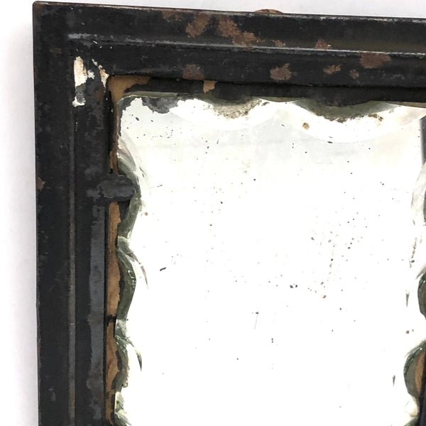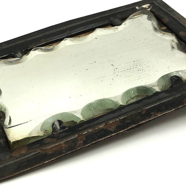 Overall 7" x 5". Mirror itself: 5 1/2" x 3 1/2". Good condition, with some paint loss and rusting the frame as evident, Mirror shows some black spots, all to the good, but remains very functional, for shaving or otherwise!
