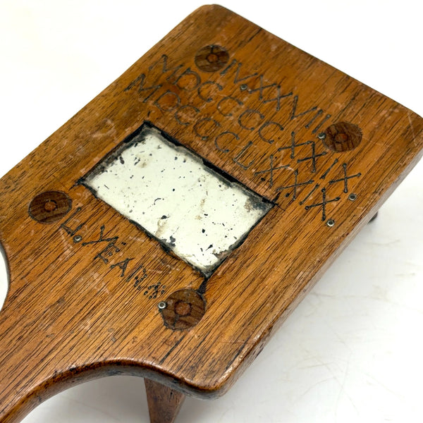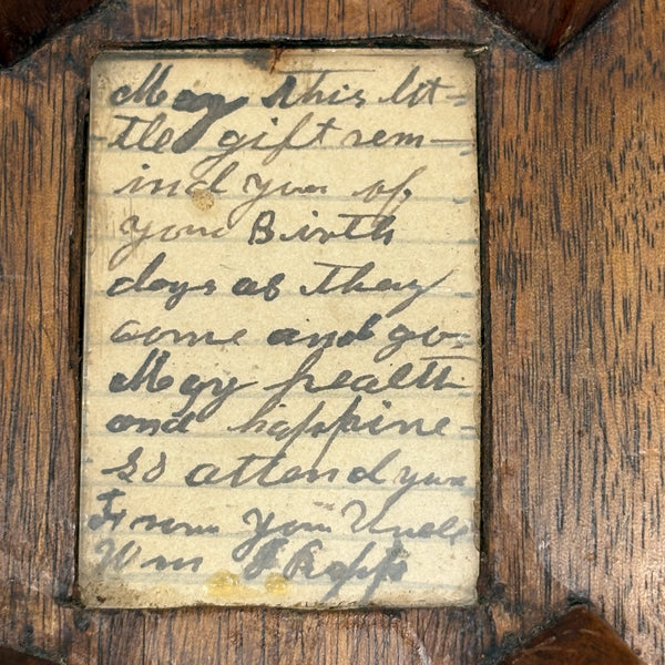 I'll never walk away from a very specific homemade token of love if I can help it, and there is so much I love rolled up into this one, including just a small fragment of a mirror, which is of little practical use but gives the whole charming creation at least some presumption of function--while also making it feel very precious, as (earlier than this one) fragment mirrors certainly were. And clearly the Uncle William who made this had grand aspirations--opting to use Roman numerals to mark the year of his niece's birth (1879) and the year of the gift's making (1929). My favorite thing is the "L. Years" right below the mirror, marking her 50 year birthday (wonderfully awkwardly as "L. Years"). On reverse, his handwritten note to her inlaid, under glass: "May this little gift remind you of your birthdays as they come and go. May health and happiness so attend you." What could be a sweeter or more tender embodiment of the want to make something special for someone special? Total love.