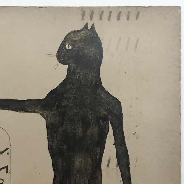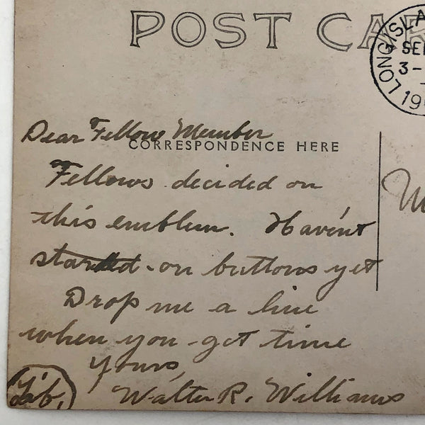 So curious! The message on reverse of this postcard, sent to a "Fellow Member" reports that the Fellows had "decided on this emblem" (though haven't started on buttons yet)! Perhaps the "A.O.C" stands for Ancient Order of Cats??? And what a cat, but I really have no idea about the corkscrew extending from one paw and apple held up high in the other. I have to think this emblem may not have endured too long, but I really love its weirdness, and do hope there are buttons out there somewhere!
