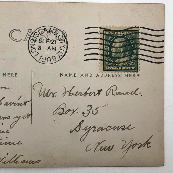 3 1/2" x 5 1/2". Sent from Long Island to Syracuse, NY in 1909, with postmarks on both front and back. A tiny bump/fold to the bottom left corner and some scattered stains but overall good condition.