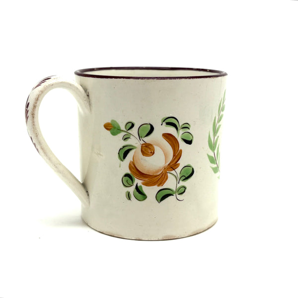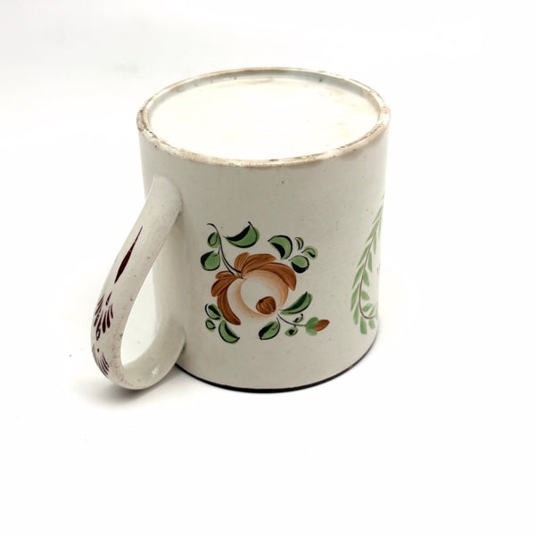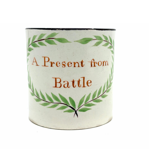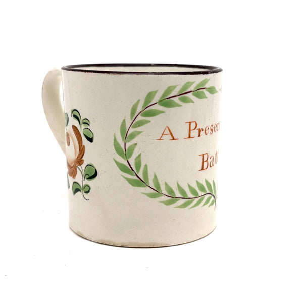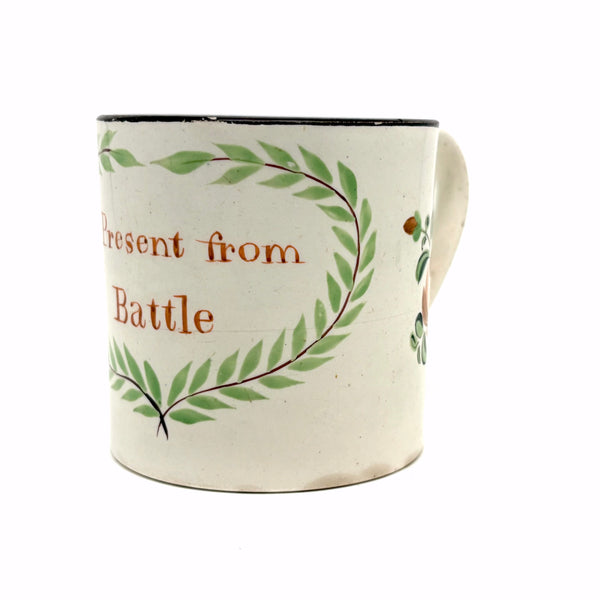 A Present From Battle, Unusual Excellent Condition 19th C. Hand-painted Creamware Child's Mug