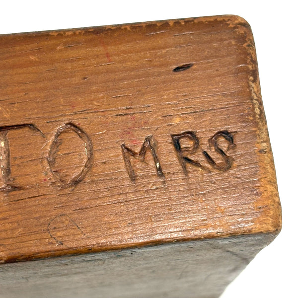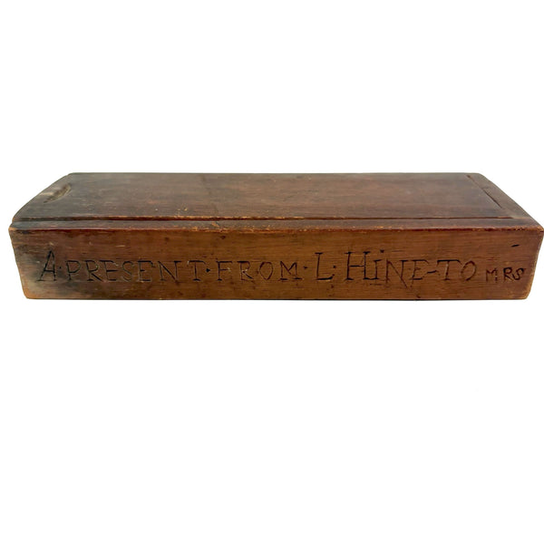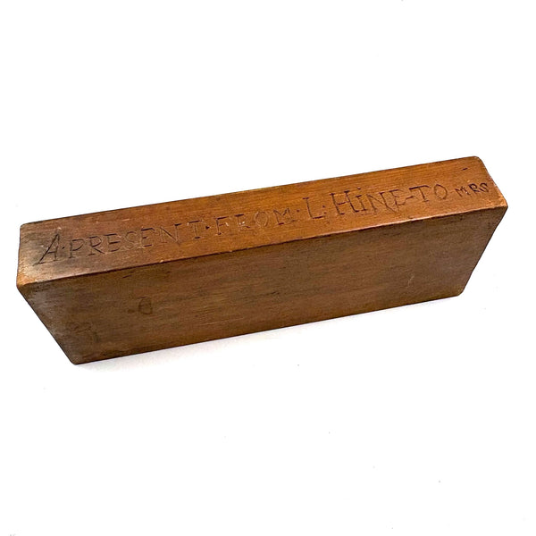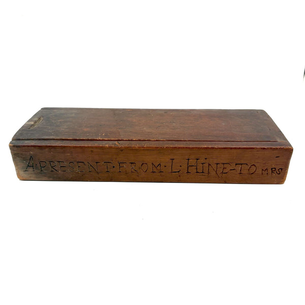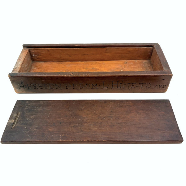 12" x 4 1/2" x 1 7/8". Good antique condition, with just a little darkening to the surface/possible little bit of water damage to the far left corner on the "A Present" side. Slide lid glides smoothly and closes tight.