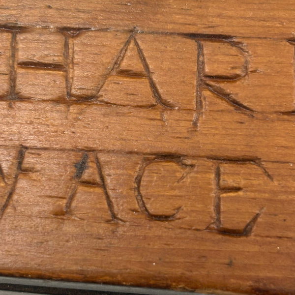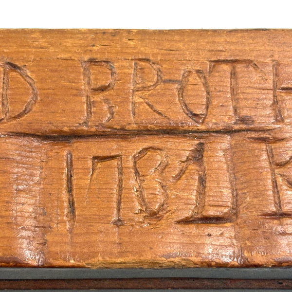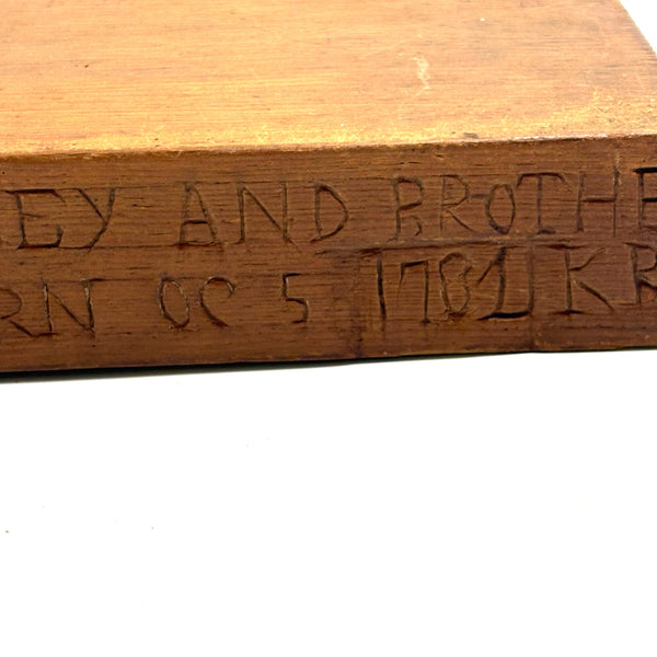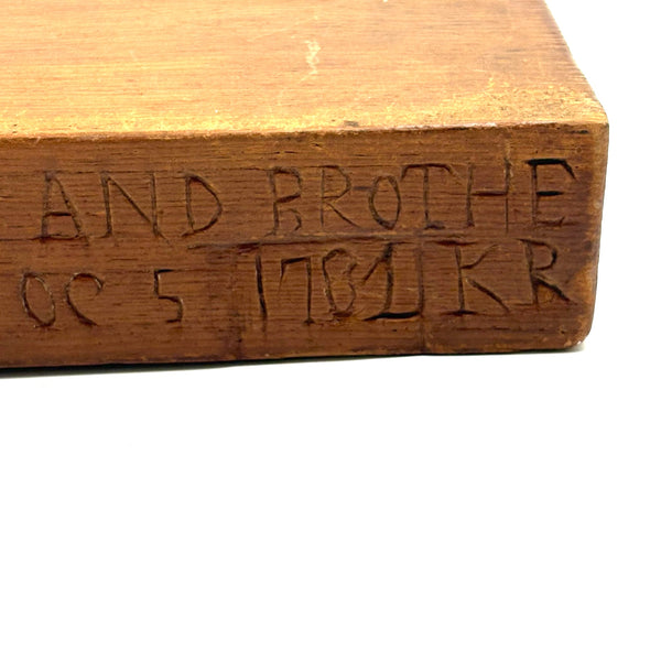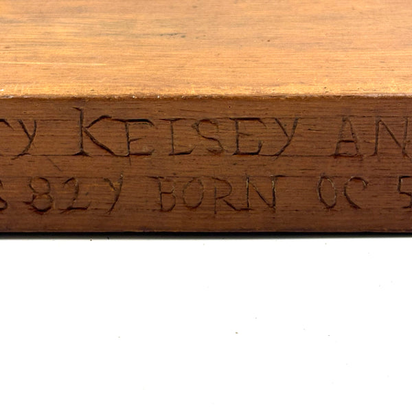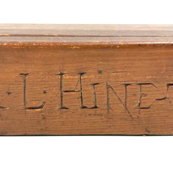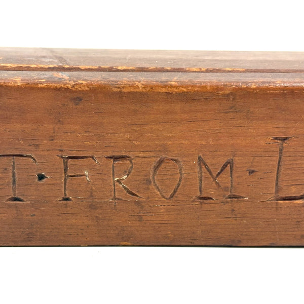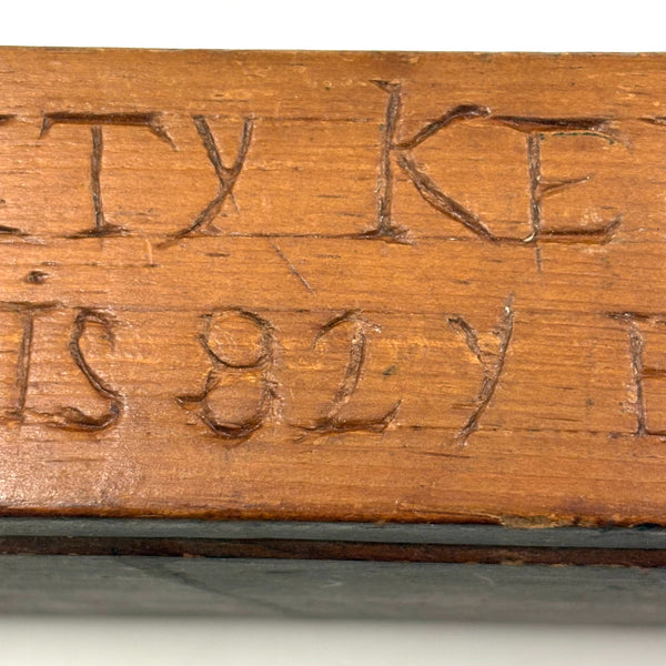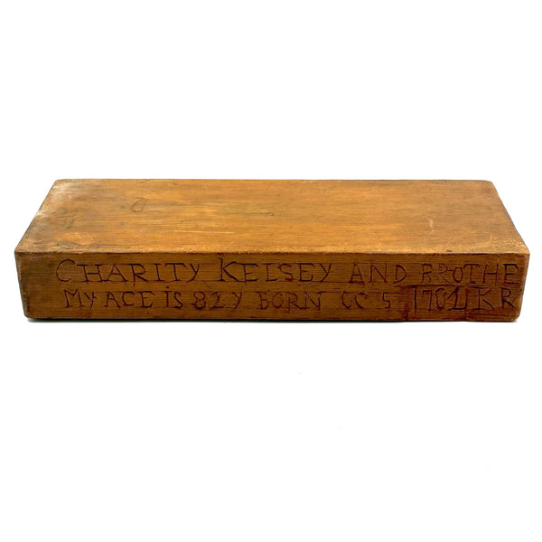 The great charms of this one are a bit subtle, but it's one of my favorite recent finds. Carved into the sides of the hand-carved slide lid box--on one side right side up, on the other upside down--is the following: A Present from L. Hine to Mrs./ Charity Kelsey and BrotheR [the R at the end of the next line] / My age is 82 y Born Oc 5 1781." Which would mean the box was carved in 1863. And with a nice detail of deeper carving at the spot where he carved in the year of his birth, as if he had to re-carve it to get it right. Quite a sweet, very heartfelt gift from our L. Hine to Charity and her brother--and quite a wonderful thing to have made at the age of 82! I presume made to serve as a candle box, to help light up their lives! So tenderly lovely.