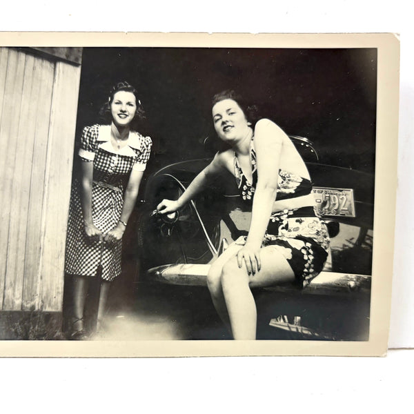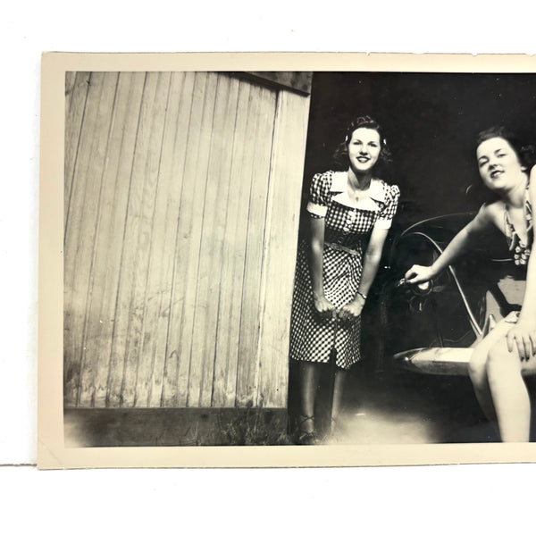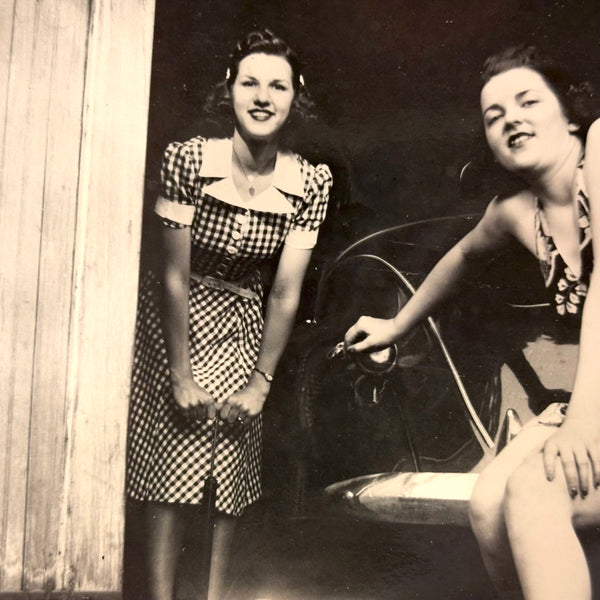 Air Pump, Halter Top, Vintage Snapshot of Two Young Women in Garage