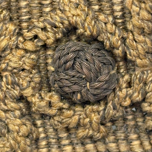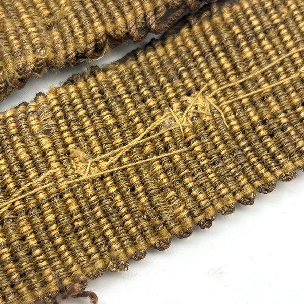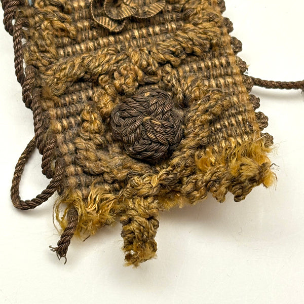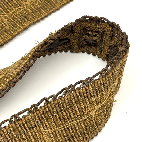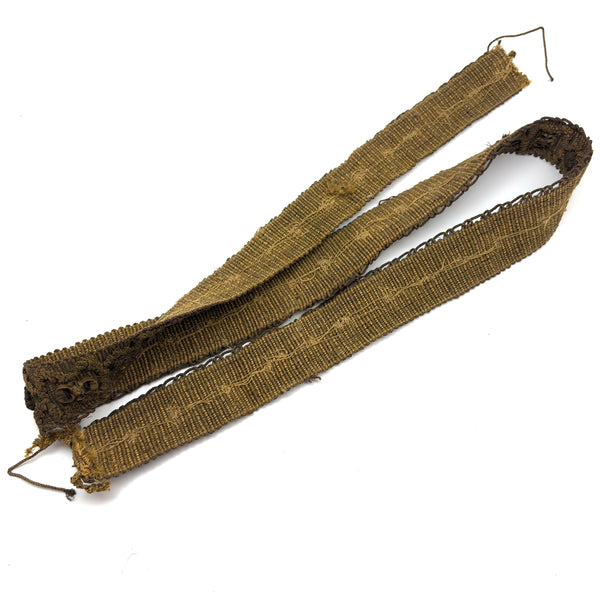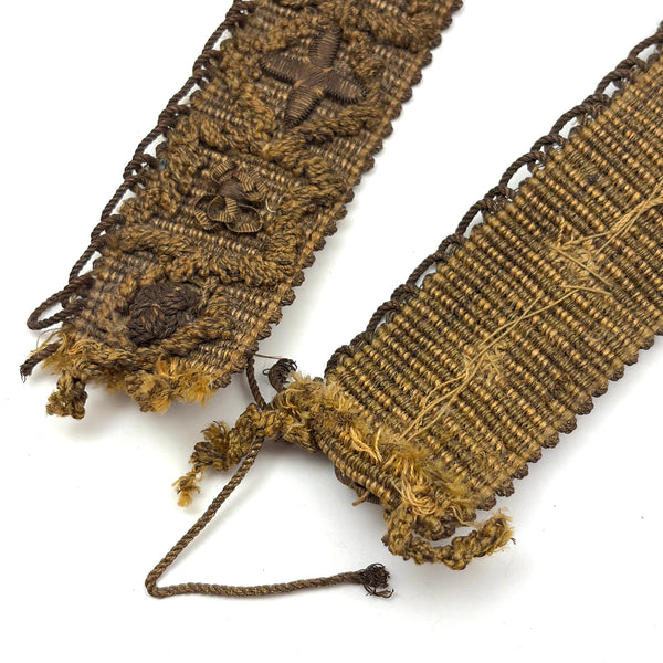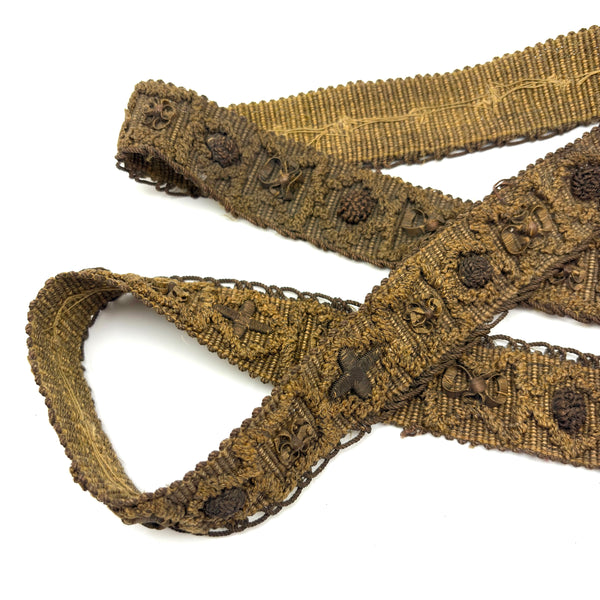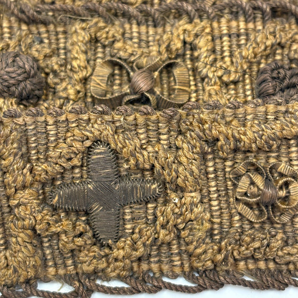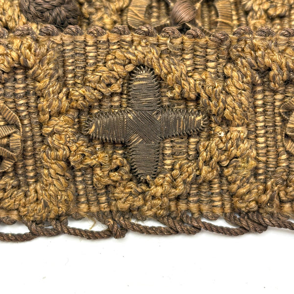 This I regard as the most special thing I've found in the last few weeks, for being very old and just blowing my mind with its construction. Handwoven of both heavy wool and metallic thread, it is a 54 inch stretch of wide trim, onto which was stitched an endless series of metallic thread wrapped metal forms--crosses, knots, and bows of several sorts. Details give a sense of the intensity of the workmanship here, but holding it in hand is a different thing; it is quite heavy and one really feels the weight of all that work!