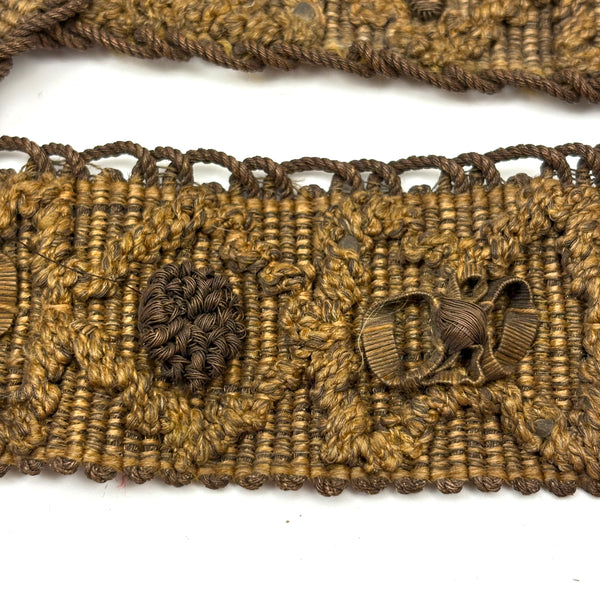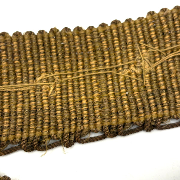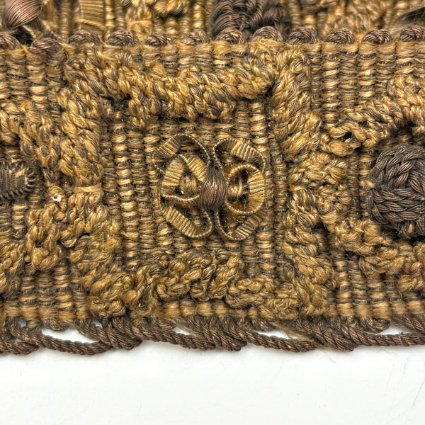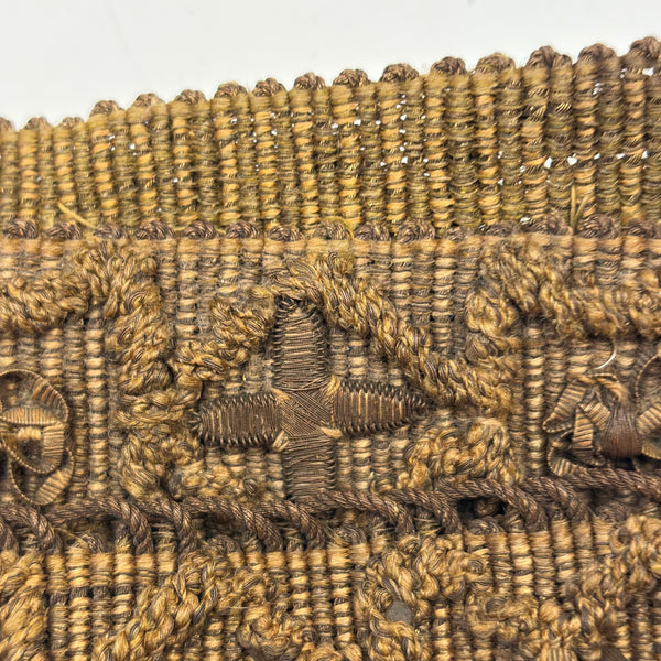 I believe English, 17th-18th century (I'd guess early 18th). Metallic thread was quite the rage among the wealthy during this period--a way to display luxury and status--and was incorporated into the weaving process of tapestries, decorative rugs, and clothing--including in the form of wire wrapped metal ribbons, as here, sewn onto the fabric of fine garments as decoration. I believe this would likely have been sewn onto a tapestry or curtains as trim, with one side of it showing braided metallic thread loops that would hang as edging, but I haven't managed to find a close match.
