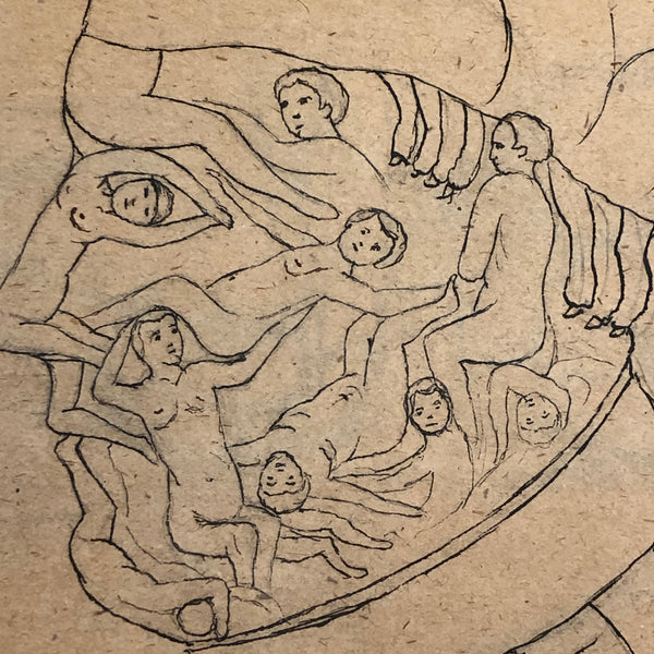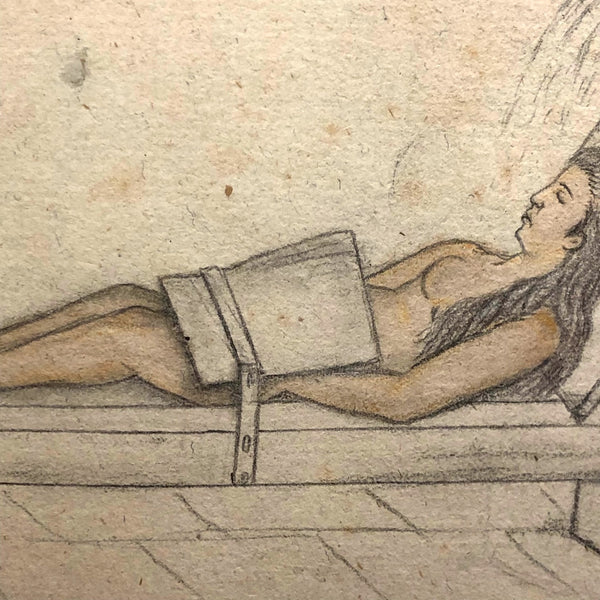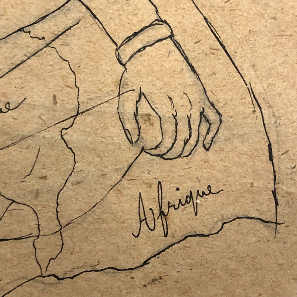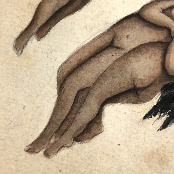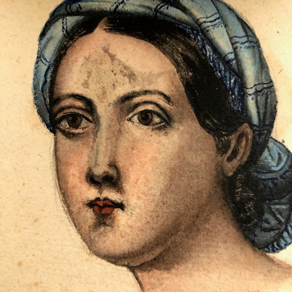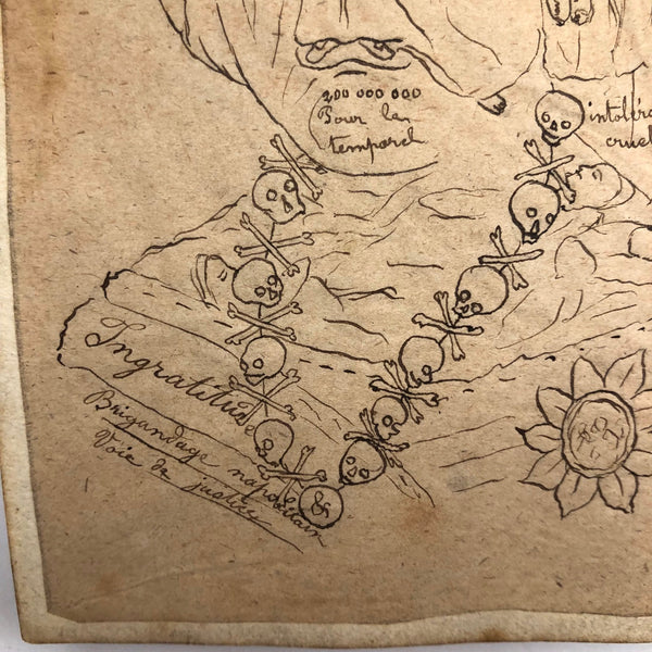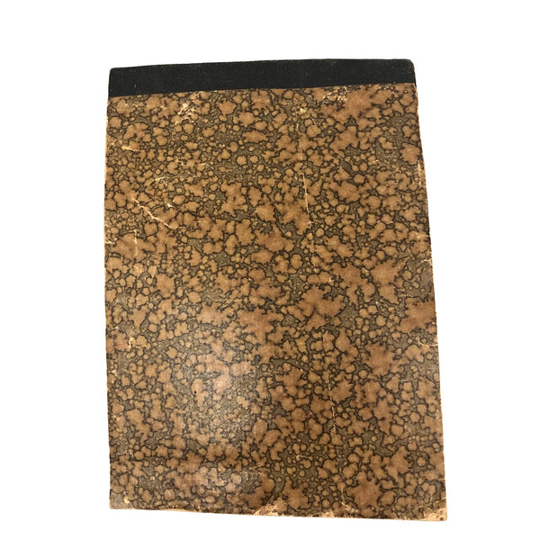 This small but chock-full watercolor/drawing sketchbook is French, 1860s, purchased from a seller there; many time better in hand than my photos convey, and really quite marvelous, including for the diversity and often unusualness --at least to contemporary eyes--of its contents. Lots of portraits of people in the gardens of Paris, or on the street--and one in the morgue (visiting the morgue was a popular pastime in mid 19th c. Paris.) A series of graphite drawings of tombs at Pere Lachaise cemetery, too, and several drawings done after political cartoons of the 19th c., including an 1813 many-drawings-within-the-drawing portrait of Napoleon. Plus some wonderful nudes. I would hate to see it broken up--as a whole it adds up to a specific portrait of Paris in the 1860s--and couldn't bear to do it myself, but there are some in here that rather scream to be framed. With a lovely hand-marbled paper over light board cover.