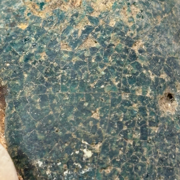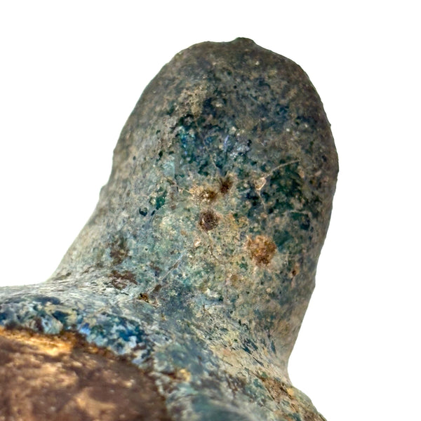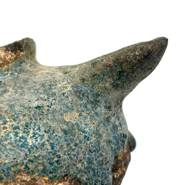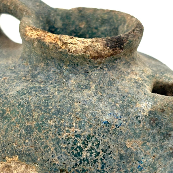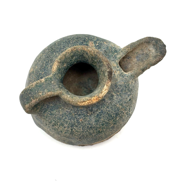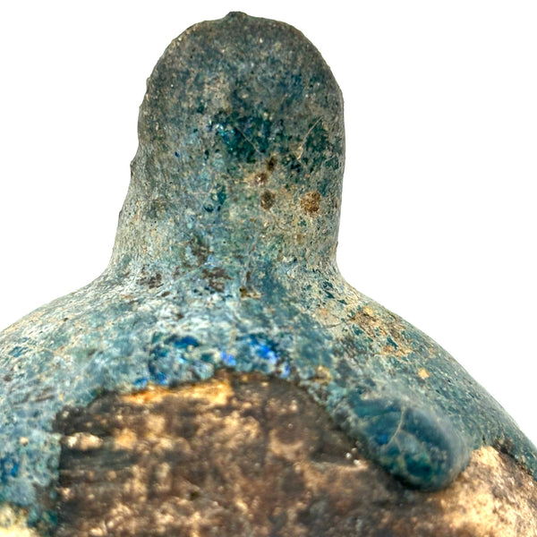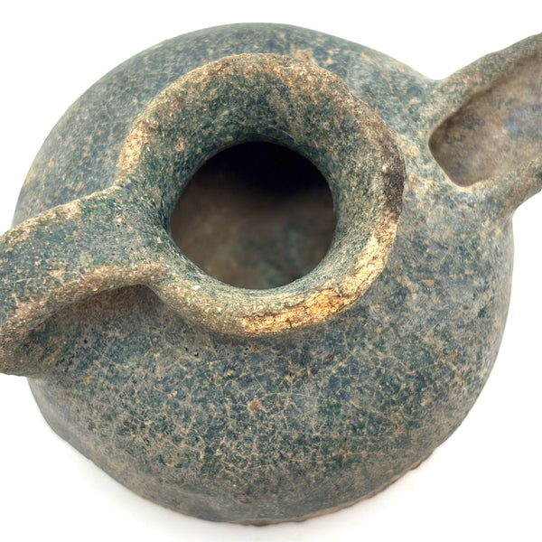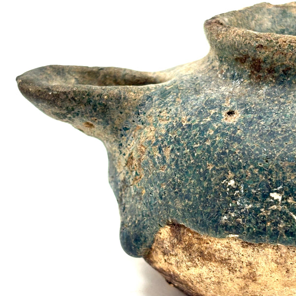 I could never be the sort of dealer who focuses on a very narrow field of objects; for me so much of the joy in doing this is discovering the existence of, and learning at least a little about, a wide range of beautiful and amazing things. And it always feels miraculous to me when I get to hold something ancient in my hands, and even more so to bring it home! This is a Persian terracotta oil lamp, c. 10th-12th century AD, with iridescent blue/turquoise glazing, like an otherworldly glassy crust. (See detail photos.) There are examples of ancient Persian oil lamps with long necks, drip pans below, and brighter turquoise glazing, but I find the compact form of this one, and the depth of the glaze color, especially beautiful.