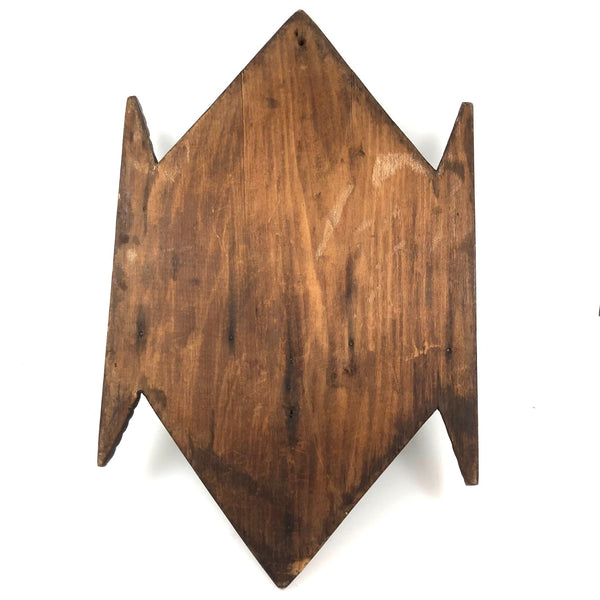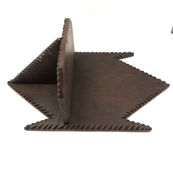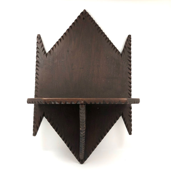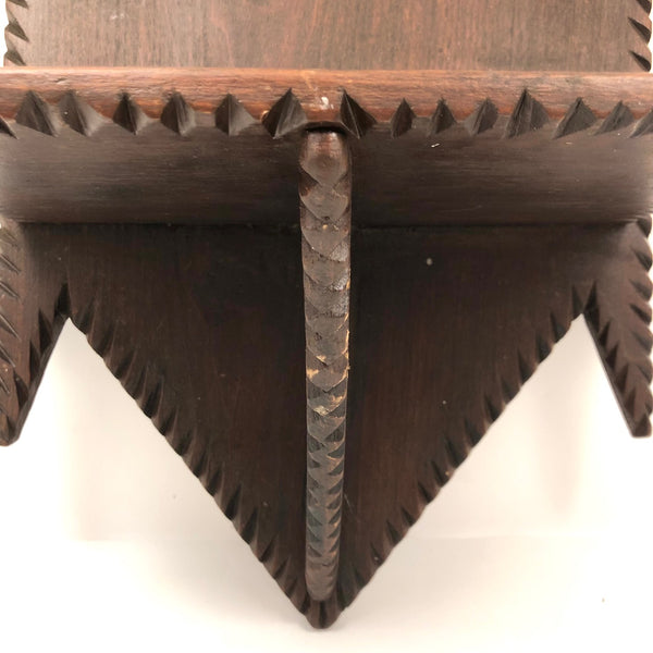 I've always got an eye out for wall shelves good for arranging a handful of carvings or a picture atop, and I think this is a good one, with enough depth to the shelf to serve as a very useful platform. I love the angular form, and the chip carved detailing around the edges, giving it a tramp art feel. Found in Pennsylvania and with some age to it for sure.