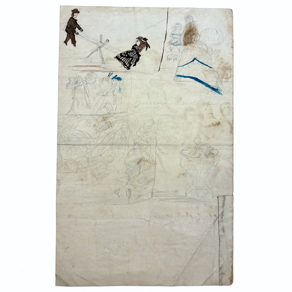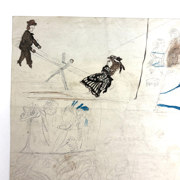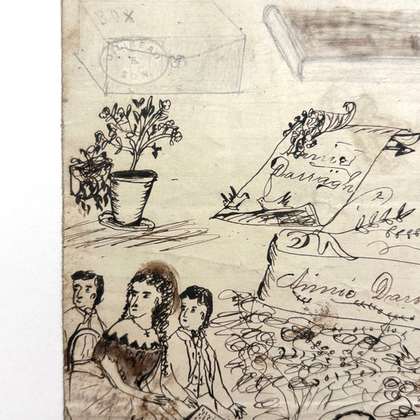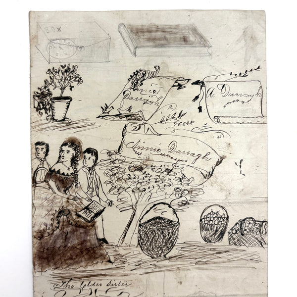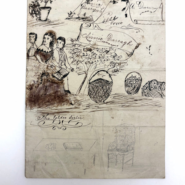 Annie Darragh, The Elder Sister, 19th C. Ink Drawing with SeeSawing Children on Reverse