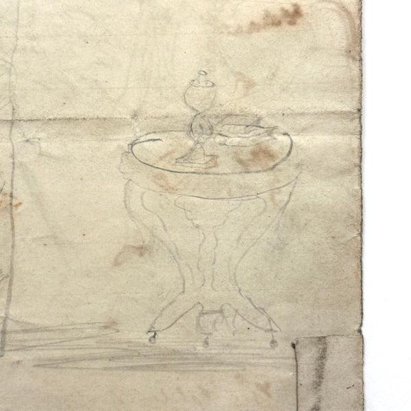 The drawing of the "elder sister"--book open, cross around her neck, and younger brother to either side-- is what first sold me on this 19th c. ink drawing, but there are more delights to be found everywhere, including those great baskets filled high with fruit, that energetically rendered tree (the source of the bounty I presume) with a little bird on a branch to the right side, and a series of scrolls announcing the drawing as the work of a young Annie Darragh. And on reverse a charming little drawing of two children in hats on a see saw, plus more little sketches in graphite on both sides. I just can't walk away from drawings like this.