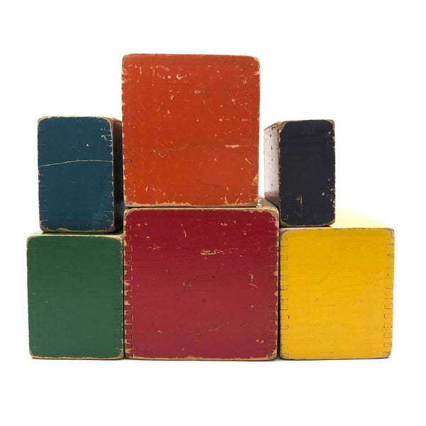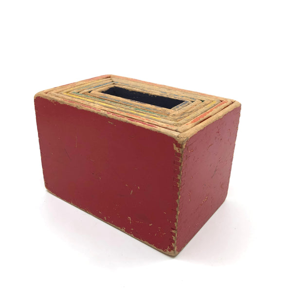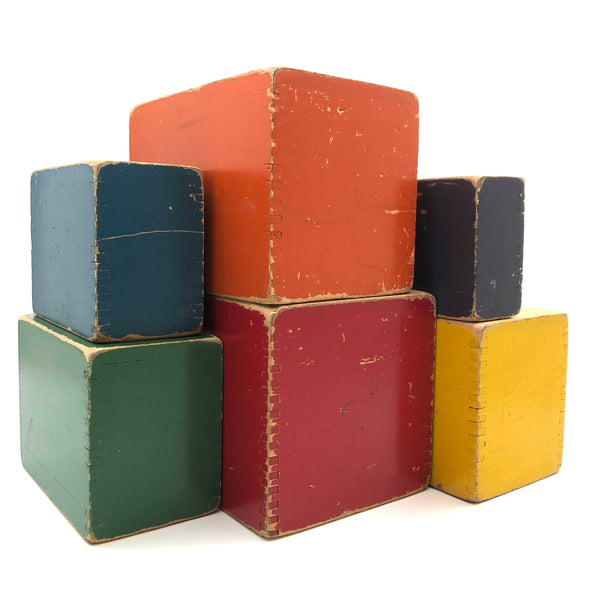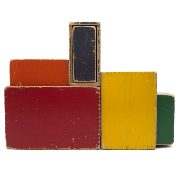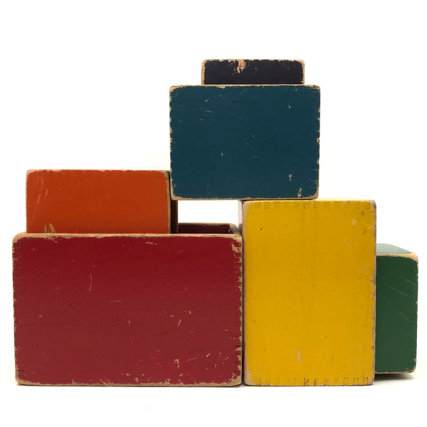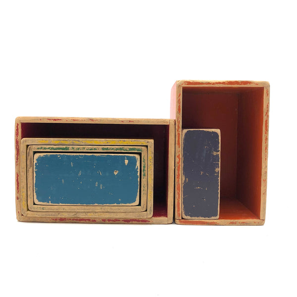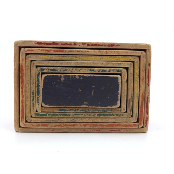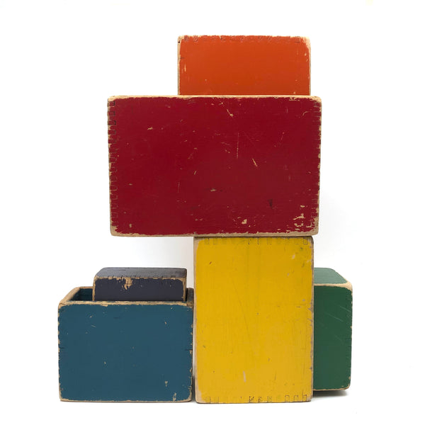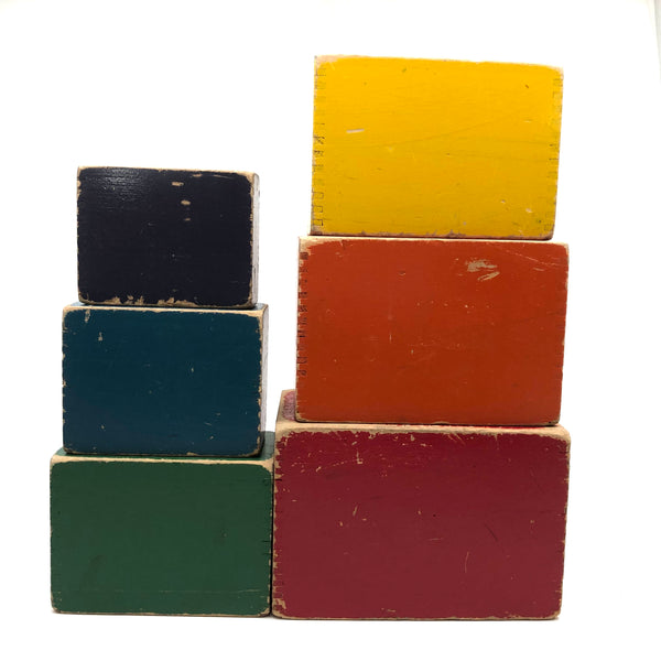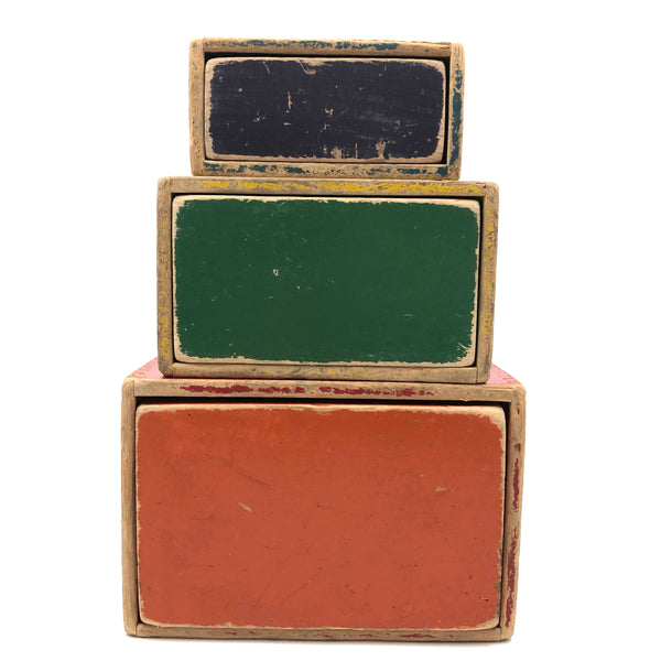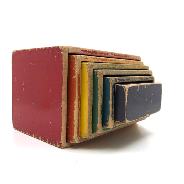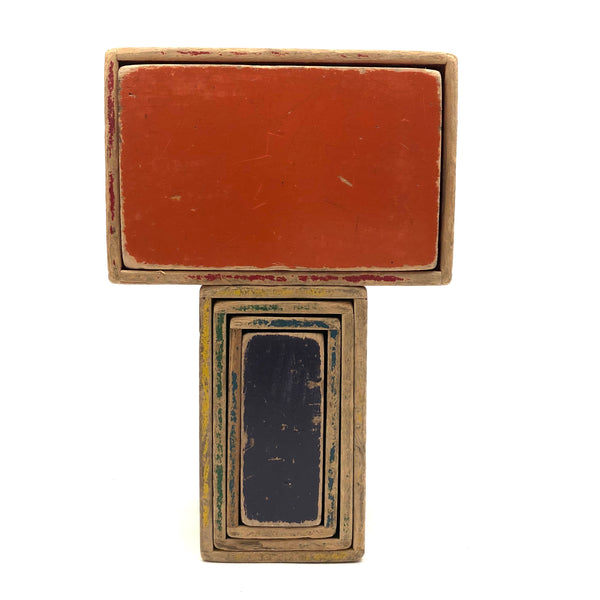 I never find these old nesting/stacking blocks, but then I found two complete sets in as many weeks! I don't believe I've ever seen such elongated rectangle-shaped ones as these, though--which make we want to have another more squarish set on hand to arrange in combination! Well loved, with the most paint loss to the rims, as should be the case, and I think is all to the good. I'll never say no to a set of these, good in so many ways.