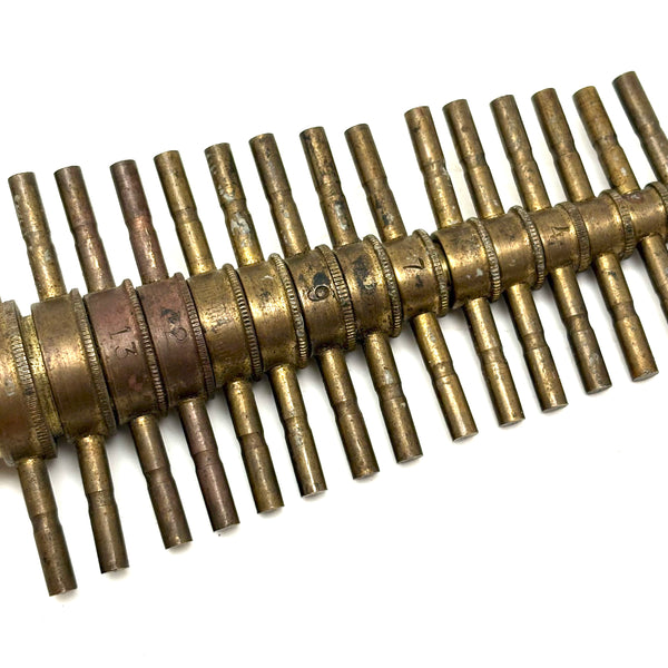 8 3/4" l x 2 3/4" widest x 7/8" d. Borers labeled 1-15, progressively. General wear, including a bit of spotting to the surface of the brass here and there, and with a few of the borers requiring some force to pull out.