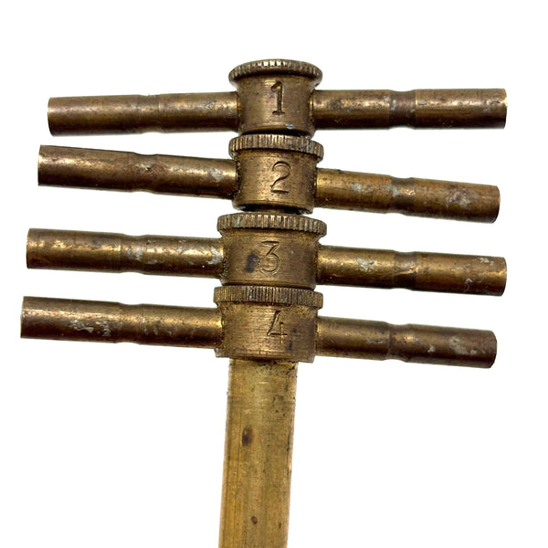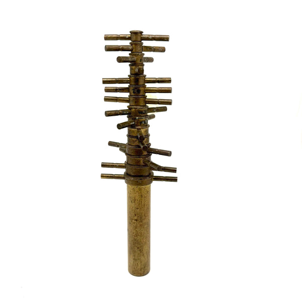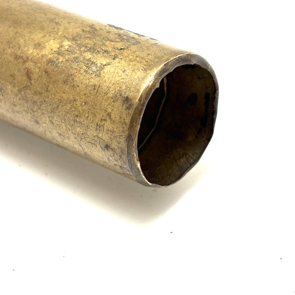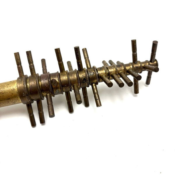 I found this in Pennsylvania earlier this summer--such an excellent looking object! It is an brass cork borer, early-mid 20th century, made for use by labs and apothecaries to bore holes in cork for plugging bottles and vials. There are 15 numbered borers of progressive sizers, one fitting inside the next, and pulling apart as needed. The borers are graduated every 1/16”, the smallest will cut a 1/8” hole and the largest cut a 13/16” hole.
