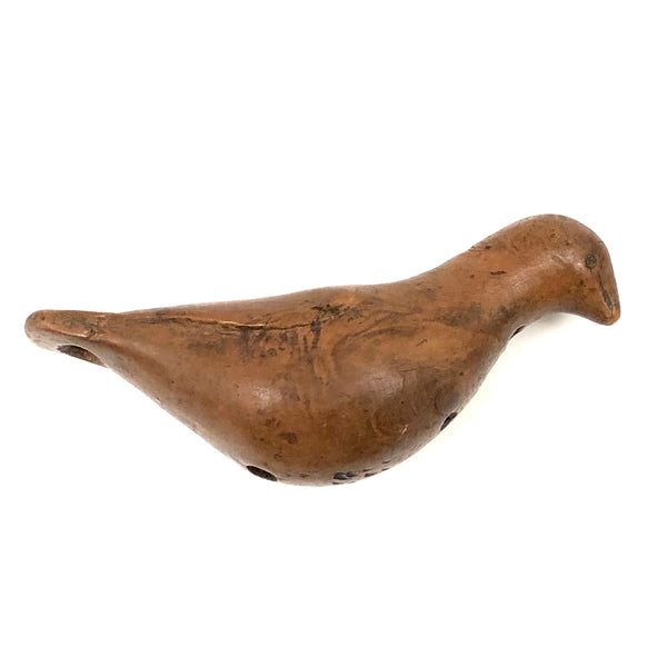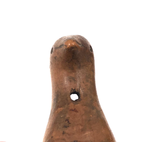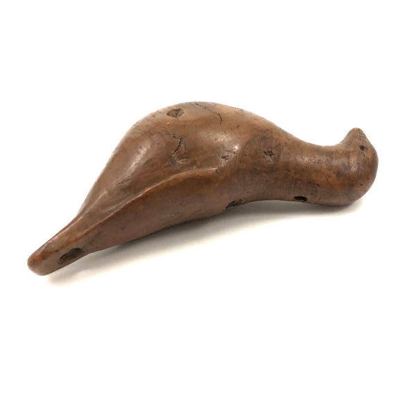 A bit of a mystery, this bird, but such a beautiful thing, which came from the collection of "Smitty" Axtell, who was a great lover of carved treen objects. Carved of burl wood I believe, it feels to me Native American, bearing a strong resemblance to birds carved on effigy pipes and ladles, but I don't know for certain, and the reason for the holes carved down the back and up the belly is unknown, though it would seem likely it functioned as a tool of some sort. Whatever the case, it is definitely old, beautifully carved with a very nice surface--and, as demonstrated with the handle of a paintbrush I had lying around, is easily perched on a stand or stick or post.  A special feeling, much handled thing, which one really just wants to carry around, fitting perfectly in the palm of the hand with fingers wrapped around it.