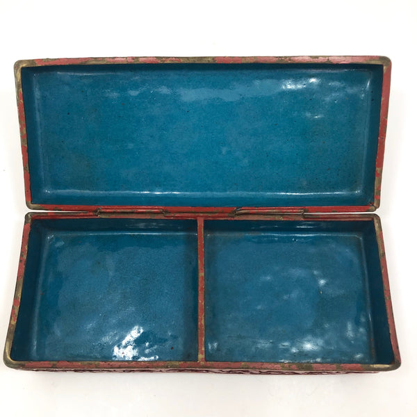This box--measuring 8 1/2" long x 3 5/8" deep x 2 3/8" tall-- is in very good condition, with no damage at all to the carving. There is a bit of loss of lacquer just around the edges of the box, very minor, and the interior enamel is in near perfect condition. The hinges are in good shape, firmly in place and opening and closing with ease--one must be just a very tiny bit bent, as the lid sits at just the slightest bit off square (maybe 1-2 degrees), but still flush to the bottom.