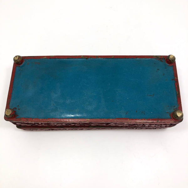 The face of this deeply carved, hinged box, which I believe dates from sometime between 1900-1920, features a scene of scholars in a traditional Chinese scholar's garden, with wonderfully detailed trees, pavilions, rock features, and bridges. The sides of the box feature a flower and vine design. The interior and underside of the box are enameled a terrific bright blue, and the box sits on round brass or bronze feet. Really a wonderful piece.