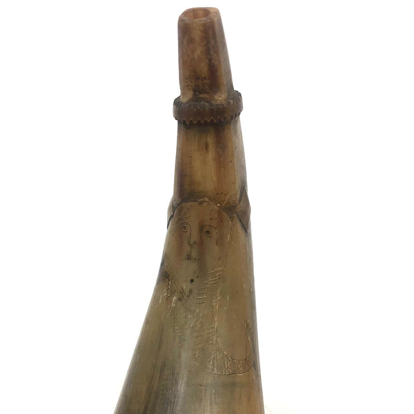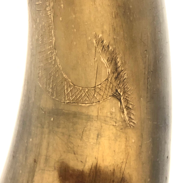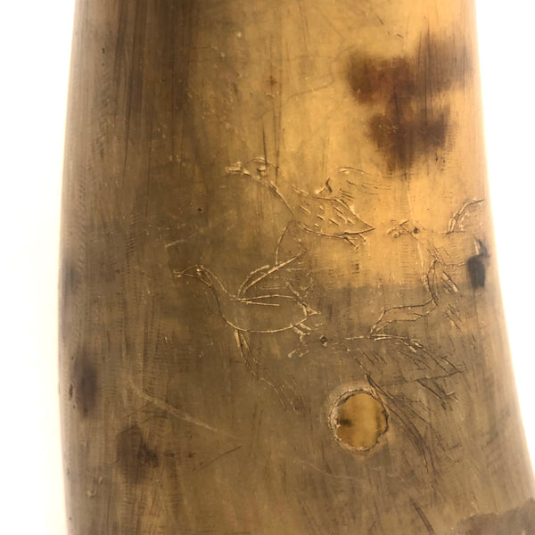 Not easy to capture in photos, and takes close looking in person to fully appreciate its attributes, but I love this thing. It's a 19th century folk art decorated powder horn, used for storing and carrying gun powder (end plug clearly long gone.) With a raised heart and a pair of diamonds carved into narrow end, and a merman/mermaid of sorts etched into the surface just below, with the corners of diamonds doubling as horns, making the creature look like the devil! A handful of flying duck/geese etched lower on the horn, too. A bit of loss to the horn around the open end, and the etching is fairly subtle, but a wonderful, singular thing.