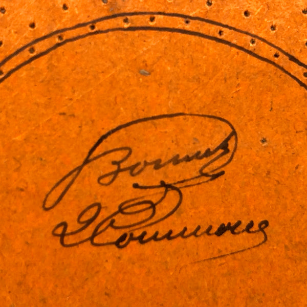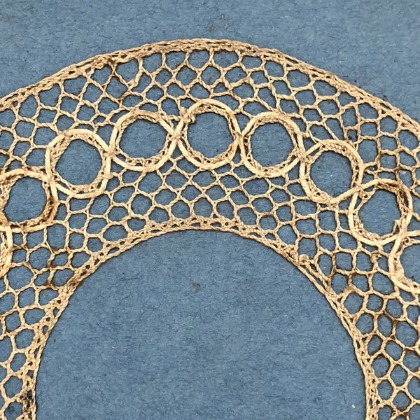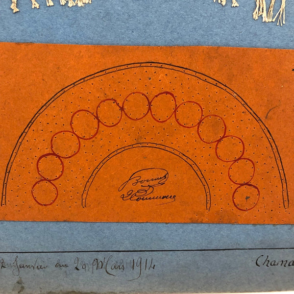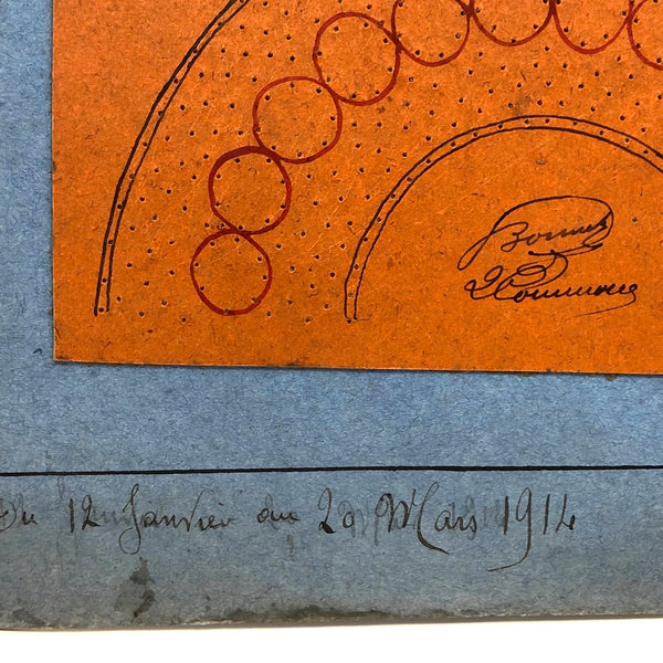 Boldly graphic and very finely detailed at once, this is a 1914 hand-knotted lace sample, with pattern, hand-drawn on orange card and used in the process of making the lace (pin pricks everywhere) mounted below. I presume done by a young woman mastering the art of making lace, though sometimes one sees similar things done by teachers, or professional lace makers, as examples. With what looks to me a signature on the pattern. All mounted to blue card-- the perfect complement to the orange (with pattern drawn in red and black ink) and white (cotton I believe) of the lace.