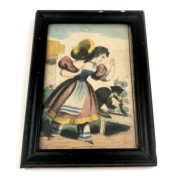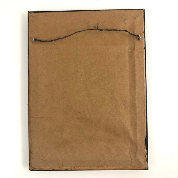 In an old black-painted wood frame, papered on the back and wired for hanging. Framed size: 8" x 5 7/8" x 3/4". Visible image: 6 1/2" x 4 3/8". A couple of chips to the surface of the frame along the top, and one small tear in the print at top center. No real matter, I'd hang it exactly as it is, perhaps on the wall right about the cat dish! There is a little glare caught in the photos.